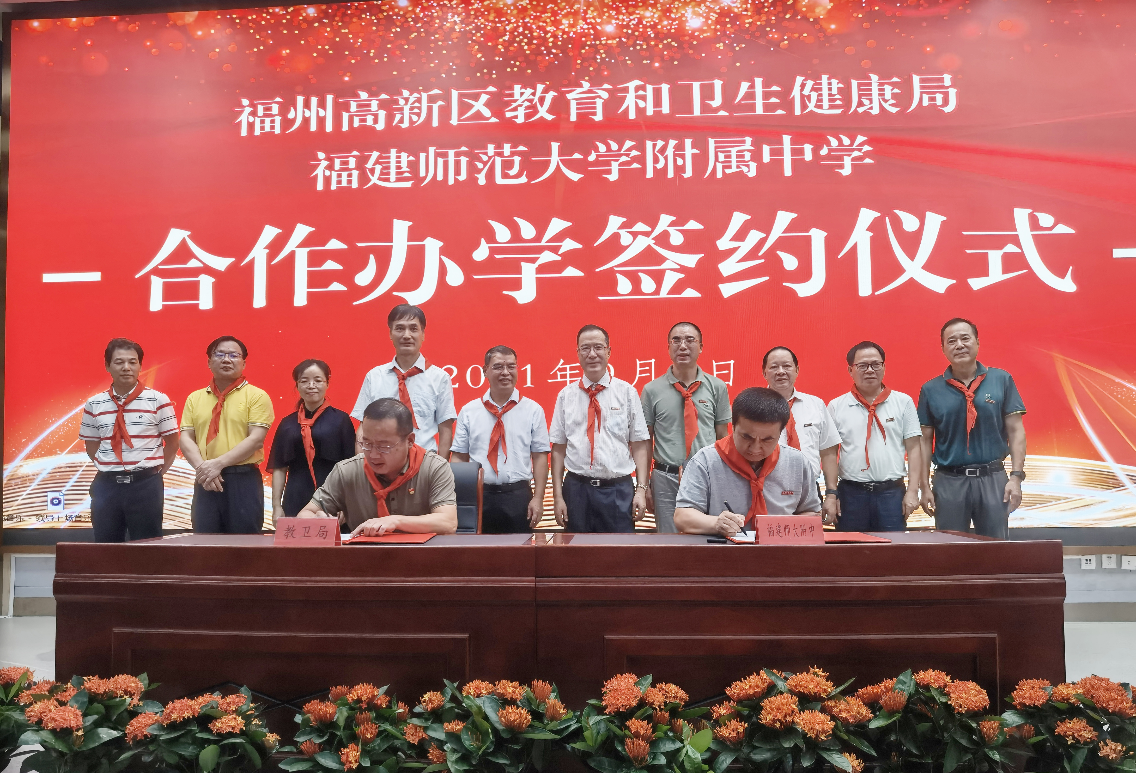 9月1日,我校与福州高新区举行合作办学签约暨揭牌仪式。高新区管委会书记魏邦仲、二级调研员林松旺,高新区党政办、教卫局、产学研办等有关部门负责人,我校校长王长平、副校长郑家建,教育学部、附中、附小以及南屿初级中学、第三中心小学相关负责人参加了仪式。