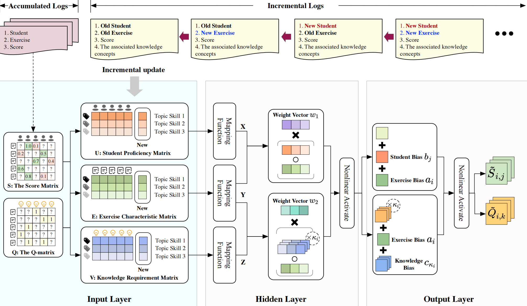 针对这一难题,课题组创新性地提出了一种增量式非线性协同隐因子分析(IN-CoLFA)模型。该模型增强了隐因子分析框架,通过协同分解技术,将学生得分矩阵与专家提供的习题知识点关联矩阵进行联合建模。同时,还融入了受神经网络启发的非线性结构,以捕捉学生与习题之间复杂的交互关系。为了实现高效的增量学习,该模型被无缝拓展至增量版本,使其不仅能对历史数据进行离线训练,还能在新数据持续产生时不断优化和完善预测。在多个数据集上的实验结果表明,无论是在静态还是动态学生表现预测任务中,IN-CoLFA模型均表现出有效性和高效率。