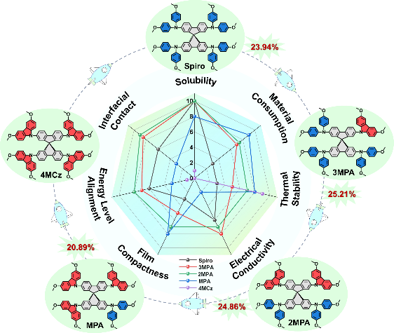 2,2',7,7'-四[N,N-二(4-甲氧基苯基)氨基]-9,9'-螺二芴(Spiro-OMeTAD)作为经典的空穴传输材料被广泛用于钙钛矿光伏电池中。然而,其需高浓度掺杂的特性会严重影响器件稳定性。因此,如何在保持高效率的同时,实现对螺环型空穴传输材料性能的精准调控,进而构筑高效稳定的空穴传输层,已成为当前领域面临的关键挑战。