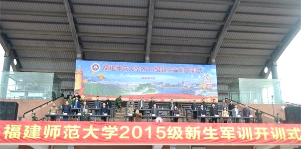 1月7日上午,我校在旗山校区东区田径场、仓山校区长安山田径场分别举行2015级新生军训开训式,军训团长袁金安同志、校学生军训工作领导小组组长叶燊副书记、副组长李敏副校长,校学生军训工作领导小组成员单位领导,各学院分管学生工作负责同志,军训团官兵及25个学院约9879名新生参加了开训式。