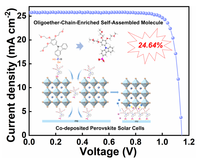 据此,我校海峡柔性电子(未来科技)学院王漾教授和安明伟副教授成功设计出一种醚氧链功能化的自组装分子3EGCPA。相较于传统自组装分子,3EGCPA的锚定基团直接键接于咔唑的刚性骨架上,增强了分子的化学和光热稳定性,且抑制了分子在溶液态下的聚集。同时,多醚氧链的引入提升了材料的介电常数,从而为界面电荷提取提供了充足的驱动力。因此,将3EGCPA用于共沉积钙钛矿电池中,可以实现致密的底界面空穴选择层。同时,得益于材料自身介电常数的提升,界面非辐射复合损失被显著抑制,最终实现了24.64%的高光电转换效率。该成果为开发适用于共沉积工艺的高效稳定空穴选择层提供了一种全新的分子设计策略。该项工作以“Oligoether-Chain-Enriched Self-Assembled Molecules with High Dielectric Constant for Co-Deposition of Efficient Perovskite Solar Cells”为题发表于国际学术期刊《Small》。