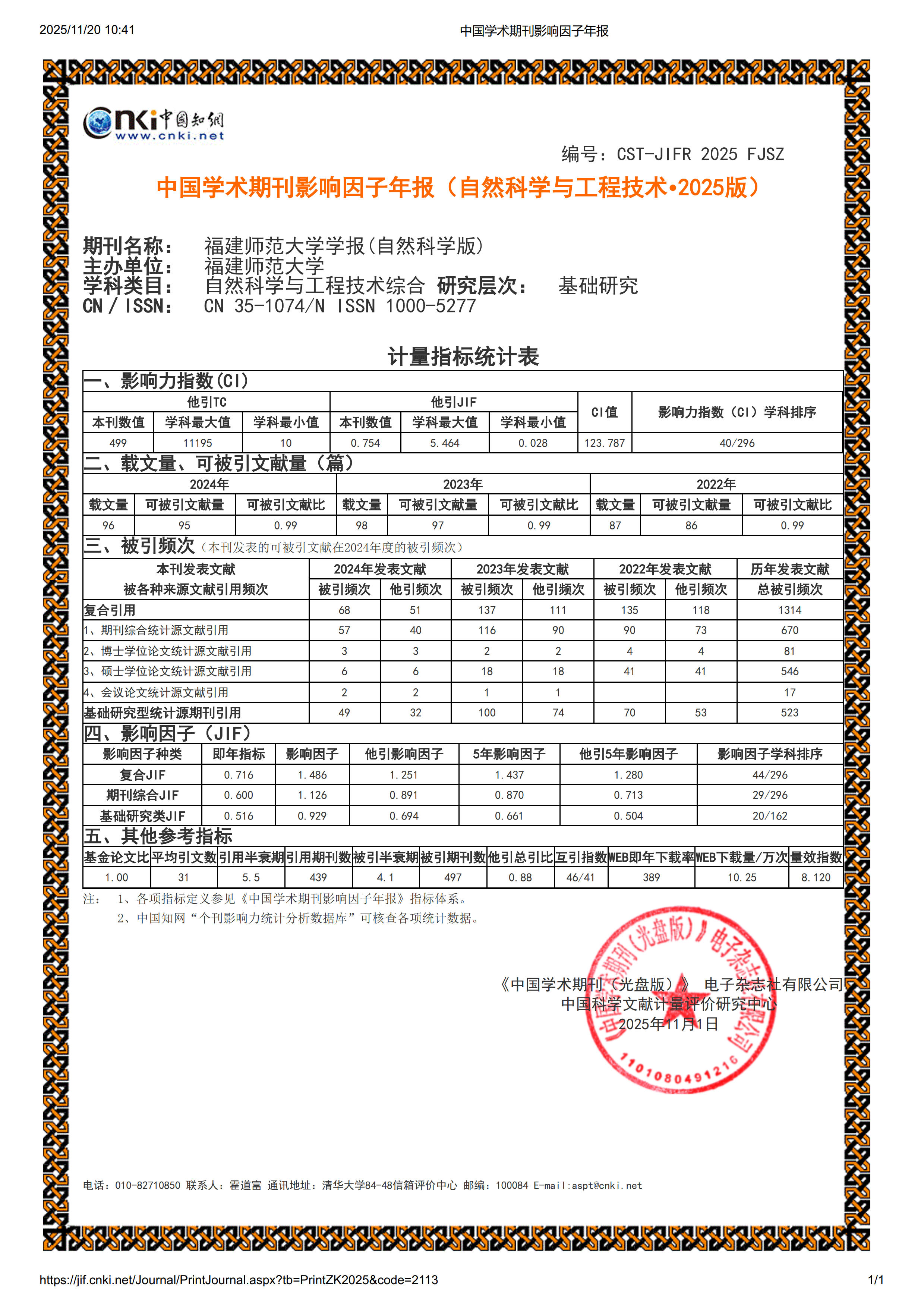 日前,《中国学术期刊(光盘版)》电子杂志社有限公司、中国科学文献计量评价研究中心联合发布《中国学术期刊影响因子年报(自然科学与工程技术• 2025版)》。数据显示,《星空下载游戏推荐安卓学报(自然科学版)》学术影响力持续提升,连续8年位于Q1区,影响力指数CI值为123.787,期刊综合影响因子相较上一年提升45.10%,再创历史新高。在自然科学与工程技术综合类296种期刊中排名第40位,相比上一年前进18位,首次跃升至福建省首位。(学报编辑部)