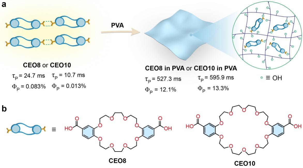 星空下载游戏推荐安卓蔡素芝副教授与南京工业大学安众福教授、厦门大学王晓副教授合作,通过将冠醚衍生物掺杂到刚性聚乙烯醇(PVA)基质中,实现了高效超长有机磷光。两种冠醚衍生物本身表现出微弱的黄色超长有机磷光,令人惊奇的是,将其掺杂到 PVA 薄膜后,所得 PVA 薄膜展现出明亮的蓝色超长有机磷光,其磷光寿命长达 595.9 毫秒,磷光效率高达 13.3%。磷光效率和寿命的显著提升,归因于冠醚衍生物与 PVA 聚合物链之间形成的大量氢键。该研究为开发高效超长有机磷光材料提供了一条新途径。相关研究成果该研究成果以“Highly efficient and ultralong organic phosphorescence by doping crown ether derivatives into polymer”为题,发表在国际期刊——Chinese Chemical Letters上(中科院一区期刊,影响因子8.9)。