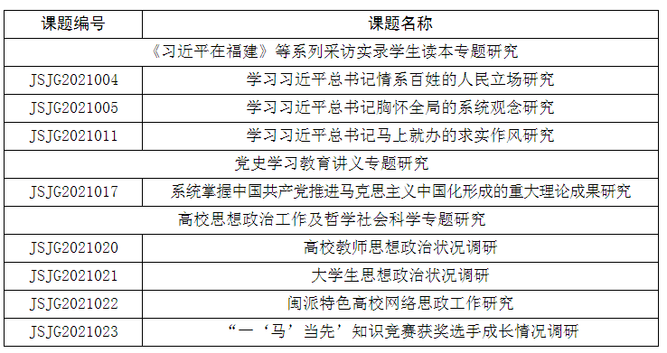 近日,省教育厅公布2021年高校思想政治工作教改课题立项名单,我校8个课题获批立项,数量居全省高校首位(全省共24项)。据悉,此次教改课题立项,旨在动员和组织我省社科研究力量深入研究和总结习近平总书记在福建工作期间的重要理念、重大实践,深入研究和探寻中国共产党百年奋斗的光辉历程、伟大贡献和形成的重大理论成果、宝贵经验、精神谱系,更好地推进党的创新理论成果进教材进课堂进学生头脑,充分发挥以研促教、以研资政作用。[宣传部(文明办、新闻中心)]