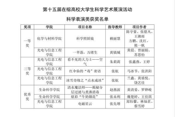 近日,福州市科学技术协会、共青团福州市委员会、福州市教育局联合主办第十五届在榕高校大学生科学艺术展演活动。我校共有8个科学表演类项目与4个科技、创新创意作品讲解类项目入围决赛,获得一等奖2项、三等奖4项、优秀奖6项,赖丽慧、黄镇城获“优秀指导教师”奖,学校获“优秀组织单位”奖。