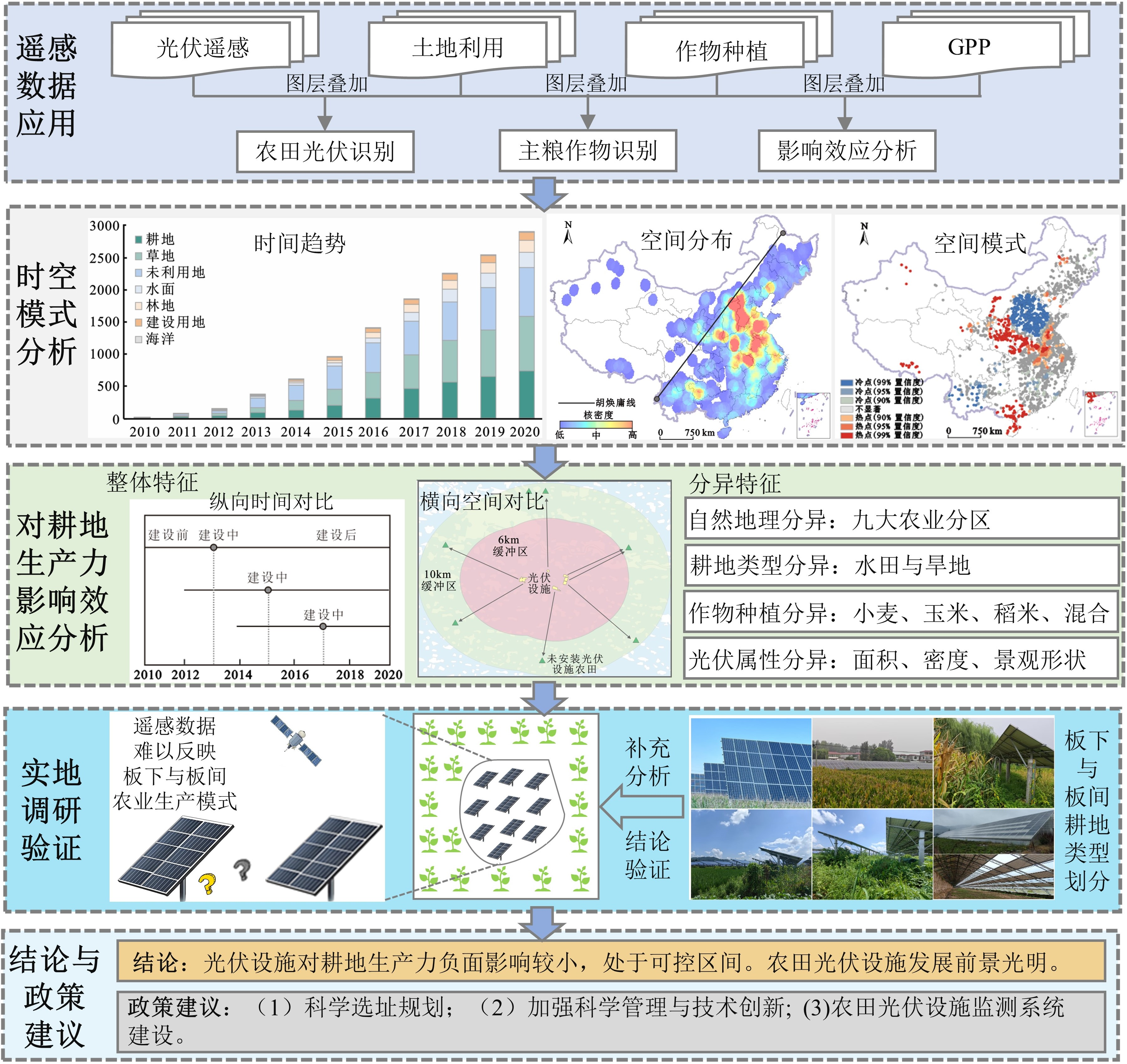 (一)解析了新能源基础设施建设对粮食安全目标的影响效应。光伏在未来能源系统中具有关键地位,但作为土地资源依赖型基础设施,其对中国粮食安全目标的影响引发普遍担忧。研究基于光伏设施、GPP、土地利用等多源遥感数据,并以实地调研数据作为补充,从宏观层面证实了农田光伏设施对中国粮食安全目标基本不构成负面影响,整体发展前景光明。作为能源转型基础设施与粮食安全目标关系的早期探索,研究结论可为未来光伏设施空间选址规划提供决策参考,为能源转型、粮食安全、乡村振兴三大目标协同推进提供学术支撑。