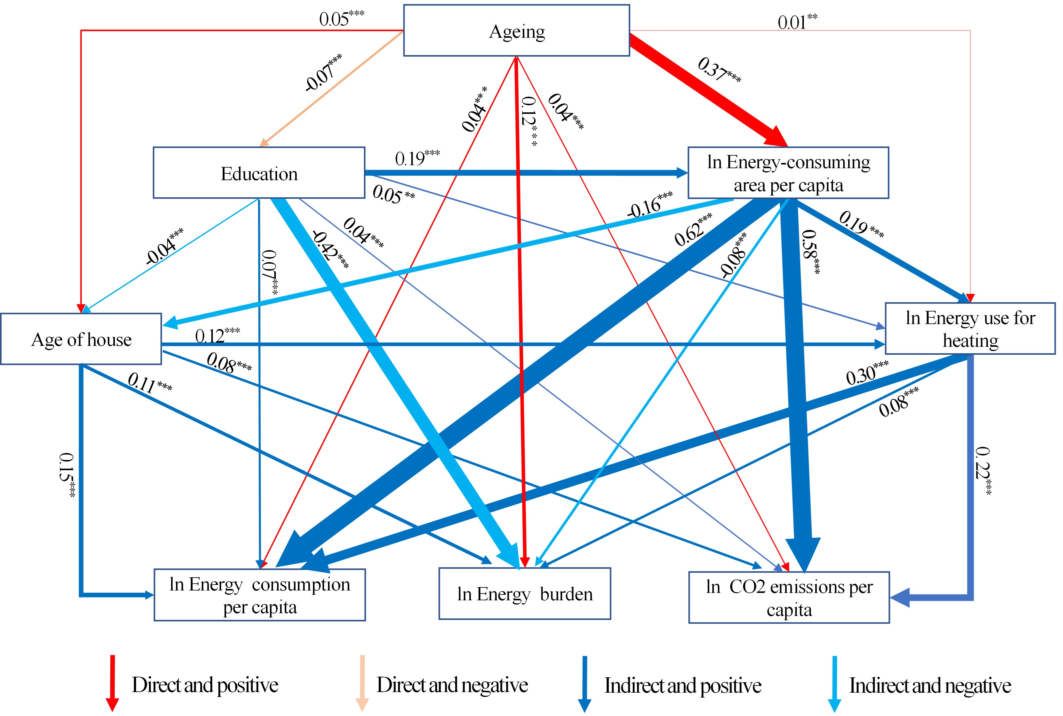 (一)揭示并预测了老龄化对家庭能源消费碳排放的影响特征与趋势。作为全球人—地关系健康发展中人类一侧的重大挑战,不可逆转的人口老龄化趋势已对人类活动模式产生系统性影响,但其对家庭能源消费活动的影响机制与长期发展路径仍未得到充分认识。研究基于超24000户的美国能源署能源住宅能源消费调查数据,发现老龄化是驱动美国住宅能源消费与碳排放增长的重要因子,其影响机制主要通过“居住面积”中介变量实现。未来人口情境下,老龄化将推动户均能源消费与碳排放持续增长,且成为区域与种族协调发展的重大挑战。研究填补了当前老龄化环境效应研究中仅聚焦于经济或个体行为视角,而忽视家庭年龄结构与居住模式协同作用的空白,有助于公众与决策者理解人口结构变迁背景下家庭能源消费与碳排放的长期发展路径。
