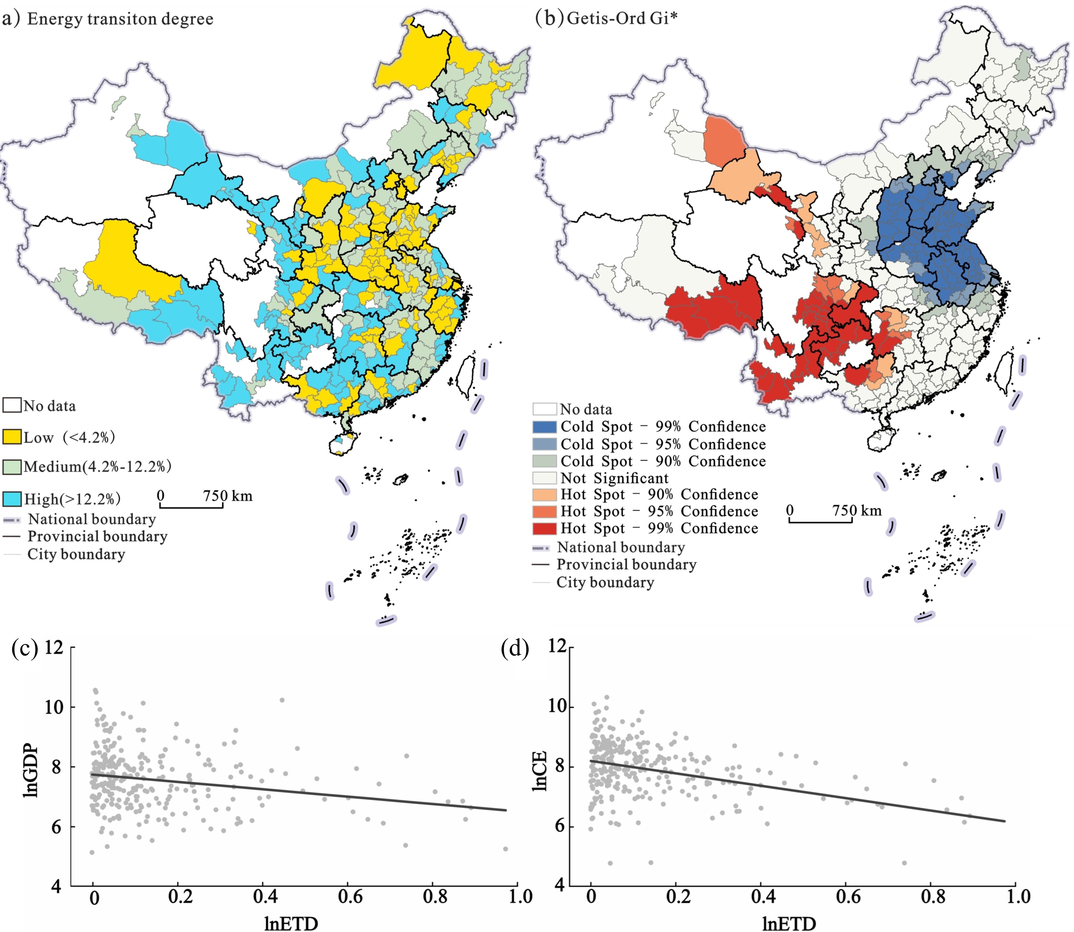 (二)剖析了能源转型背景下城市碳减排的驱动因素及其异质性特征。能源转型是实现碳中和目标的核心路径,但城市尺度下能源转型与CO₂排放的复杂关系尚未得到充分研究。基于中国296个城市的碳排放与能源转型数据,发现中国城市能源转型“西高东低”的空间格局,与经济发展水平和CO₂排放呈现明显的空间错配,增大了城市尺度温室气体减排的难度。能源转型程度每提升1%,可推动城市CO₂排放降低约0.9%(P<0.01),但其减排效应存在显著的区域异质性。研究揭示了城市尺度能源转型的时空格局及其CO₂减排效应,为差异化低碳发展政策制定提供了科学依据。