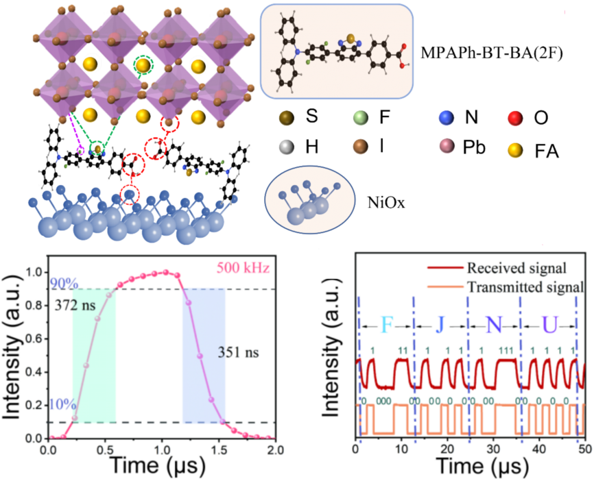 针对这一挑战,我校海峡柔性电子(未来科技)学院王越副教授采用D-A型分子MPA2FPh-BT-BA(简称2F)对NiOx/钙钛矿埋底界面进行修饰。该分子利用其给体-受体结构中的高效锚定基团与NiOx表面紧密结合,有效减少了镍空位缺陷;同时,分子骨架通过氢键和配位作用与钙钛矿前驱体相互作用,在埋底界面处诱导形成高质量钙钛矿薄膜,实现了结晶取向调控与界面缺陷同步钝化。基于此策略,团队成功制备了高性能p-i-n结构钙钛矿光电二极管,在自供电模式(0 V)下表现出优异性能:350-830 nm光谱范围内,响应度超过0.2 A/W、比探测率大于1012 Jones;在7.5 mm2的有效面积下,响应速度达到372 ns(上升时间)和351 ns(下降时间)。此外,团队还制备了不同有效面积(1.875 - 43.2 mm2)的器件,验证了该策略的普适性。这些高性能器件成功应用于光通信系统,成功传输ASCII编码字符“FJNU”,充分证明了其在高速光通信领域的应用潜力。该成果以High-performance perovskite photodiode with homogeneous crystallization and buried interface passivation for ultrafast optical communication为题发表于国际学术期刊《Materials Today Chemistry》。