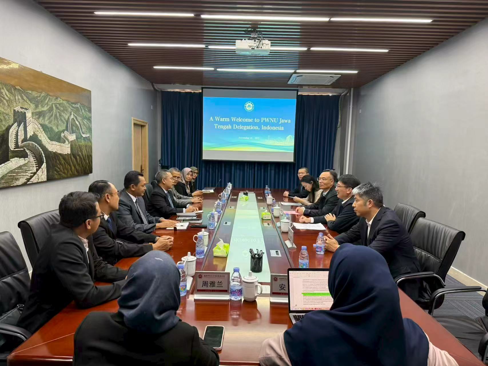 陈晓斌对来宾表示欢迎,并简要介绍了我校在合作办学、来华留学、国际中文教育、区域国别研究等四个方面的基本情况。罗津介绍了印尼伊斯兰教士联合会中爪哇分会的基本情况,表示希望在师生交流、师资培训、双联双授等方面与我校加强交流与合作,共同为中印尼友好与区域教育交流注入新的活力。