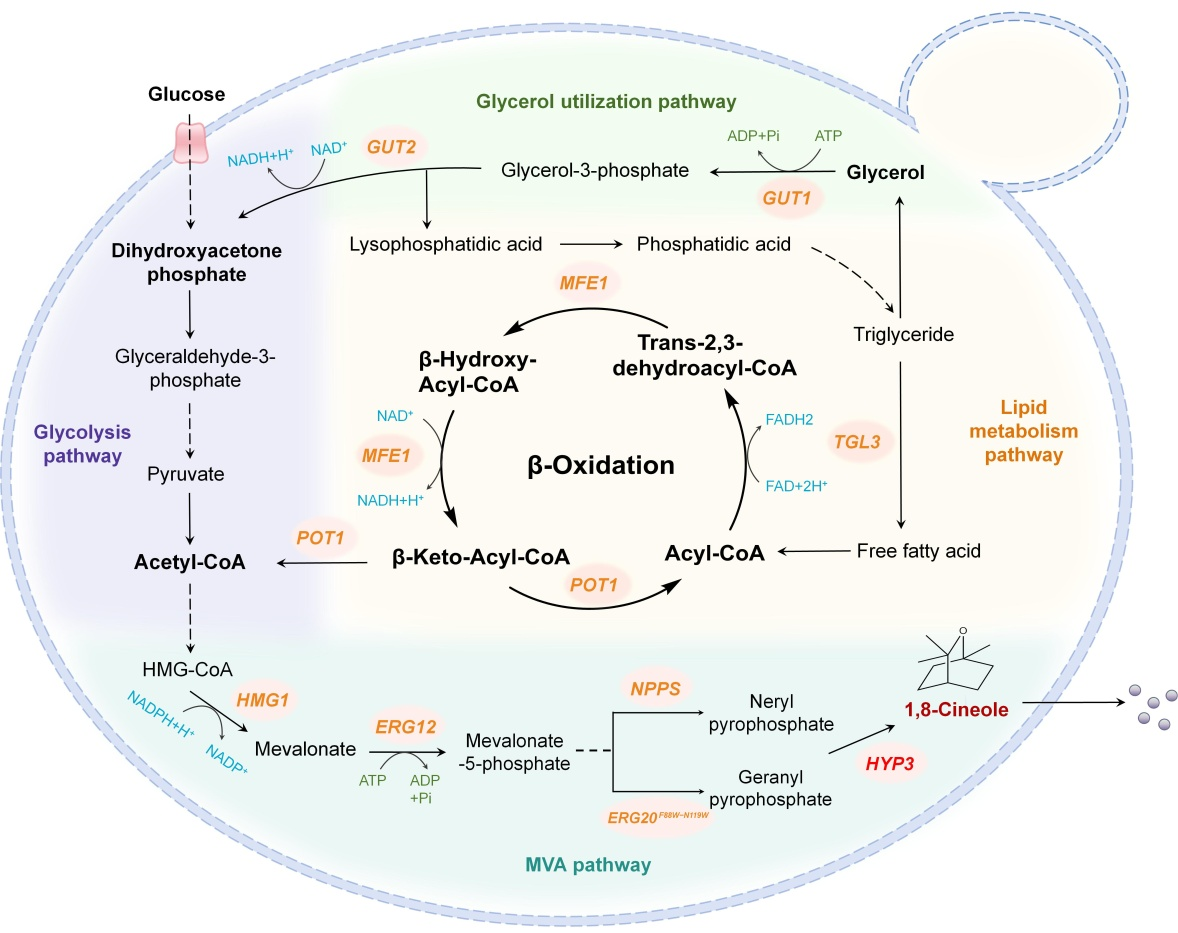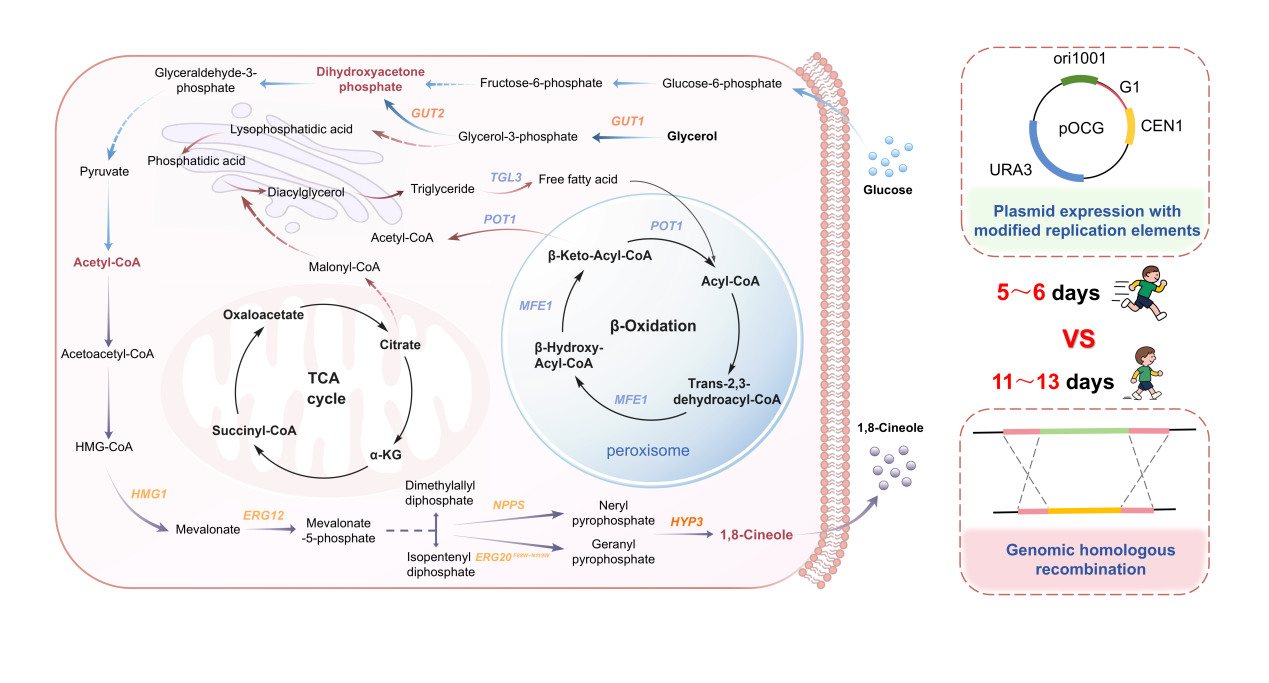 近日,我校工业微生物教育部工程研究中心祁峰课题组在解脂耶氏酵母生物合成1,8-桉叶素研究中取得重要进展,成功建立了该化合物的高效生物合成体系。该研究的核心创新在于采用基于CEN1变体的系列游离质粒系统,该系统为候选基因的快速高效筛选提供了强有力的技术支撑。相较于外源基因的基因组整合策略,此系统兼具优异的多功能性与稳定性,显著提升了遗传调控策略的优化效率。研究团队基于该系统开展了系列关键技术攻关:首先构建完成1,8-桉叶素完整生物合成途径;随后对关键前体物质甲羟戊酸合成途径进行系统性优化;进一步通过强化胞内甘油利用途径与脂质降解途径,显著提升了前体供给效率,为1,8-桉叶素合成提供了充足原料保障。
