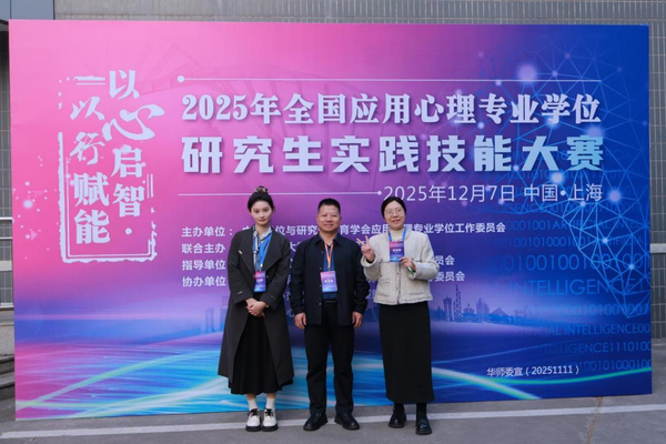 127日,在2025年全国应用心理专业学位研究生实践技能大赛全国总决赛中,心理学院应用心理专业学子凭借扎实的专业功底与出色的实践能力,取得优异成绩。2024级研究生戴哲敏(指导老师:刘洋)在心理科普作品创作赛道荣获一等奖;2023级研究生张舒婷(指导老师:刘洋)在心理咨询/心理治疗面谈技能赛道荣获二等奖;2024级研究生王晨欣(指导老师:许艳凤)在应用心理方案/产品设计赛道荣获二等奖。