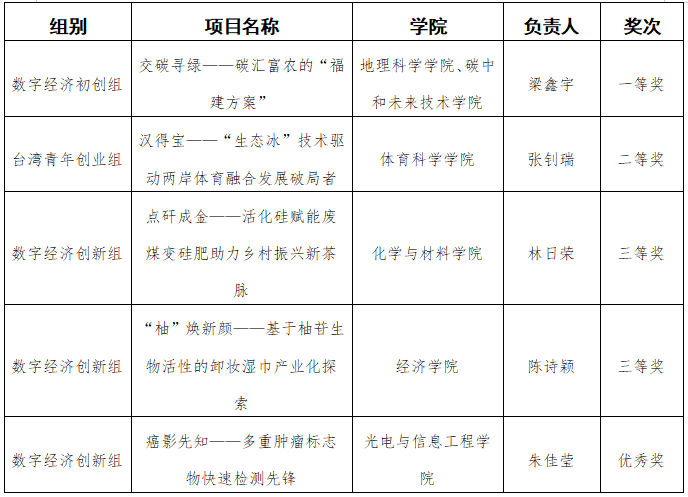 12月12日,由团省委、省网信办、省台办、省教育厅、省工信厅、省人社厅、省水利厅、省农业农村厅、省商务厅、省文旅厅、省广播影视集团、三明市人民政府共同主办的第十一届福建青年创青春大赛决赛在三明落幕。在74个入围决赛项目的激烈角逐中,我校获一等奖1项、二等奖1项、三等奖2项、优秀奖1项,学校获“优秀组织奖”。