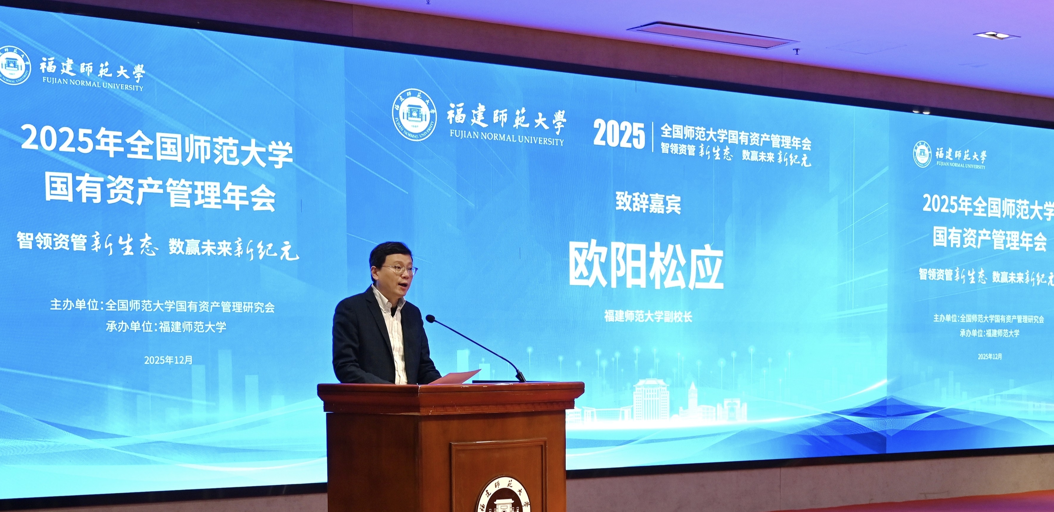 欧阳松应在致辞中表示,本次会议聚焦师范高校资产管理的关键领域与前沿问题,展示实践成果、分享管理智慧、探讨未来发展,必将为全国师范类高校探索资产管理新模式、构建资源调配新机制、筑牢风险防控新体系、提升数智驱动新动力带来宝贵的思路与启迪。