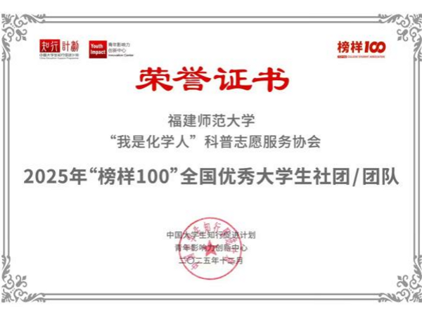 近日,共青团中央指导的“中国大学生知行促进计划”揭晓2025年“榜样100”全国大学生优秀案例榜单。我校“我是化学人”科普志愿服务协会从全国909所高校的7380支队伍中突围,成功入选。“中国大学生知行促进计划”作为国内知名大学生成长支持平台,多年来联合多方力量,累计发动超过1100所高校、50余万大学生开展各类社会实践与志愿服务,影响力广泛。(化学与材料学院)