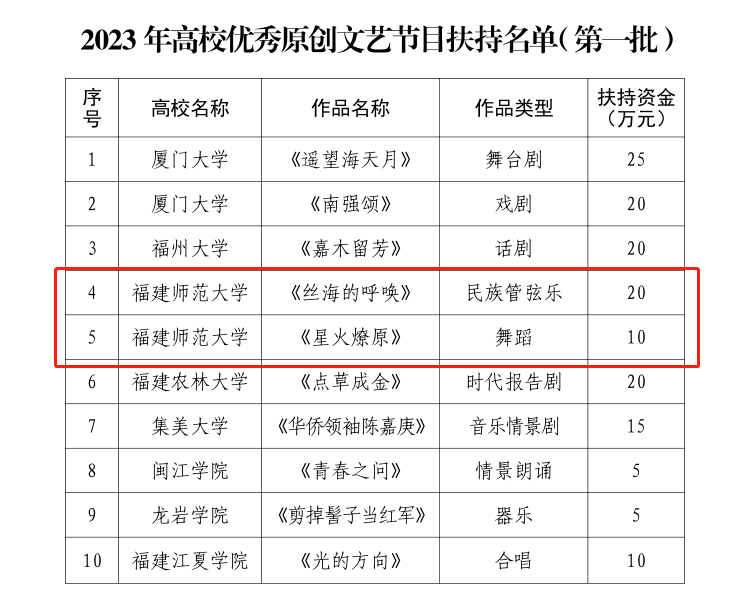 近日,省教育厅公布2023年高校优秀原创文艺节目扶持名单,共有8所高校10个节目、12所高校12个节目分别入选第一、第二批高校优秀原创文艺节目扶持范围,我校民族管弦乐《丝海的呼唤》、舞蹈《星火燎原》入选第一批扶持名单。
