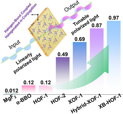 近期,该团队提出卤键耦合卤化π共轭(Halogen-Bond Coupled Halogenated-π-Conjugation)策略,即以吡啶二羧酸为母体,通过多级脱羧卤化反应,制备了一系列由卤键/氢键连接不同卤化吡啶的新型高性能光学各异性晶体。其中XB-HOF-1 (halogen-bond-assembled hydrogen-bonded organic framework)的双折射率达到0.97 @ 546 nm,这一数值不仅远超商用晶体(如α-BBO, Δn = 0.12)和众多已报道的高性能化合物,更是目前报道的吡啶基光学各向异性晶体的新记录。该工作以“Halogen-Bond Coupled Halogenated-π-Conjugation Enables Giant Birefringence in Hydrogen-Bonded Organic Frameworks”为题发表在期刊Advanced Science (中科院综合性期刊一区top)。