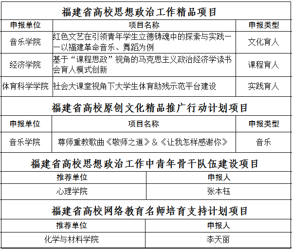 近日,中共福建省委教育工委公布2021年福建省高校思想政治工作有关培育建设项目入选名单,共遴选产生2021年福建省高校思想政治工作精品项目60项、原创文化精品推广行动计划20项、思想政治工作中青年骨干队伍建设项目5项和网络名师培育支持计划项目5项。我校6个项目入选,立项总数居全省高校首位。[宣传部(文明办、新闻中心)]