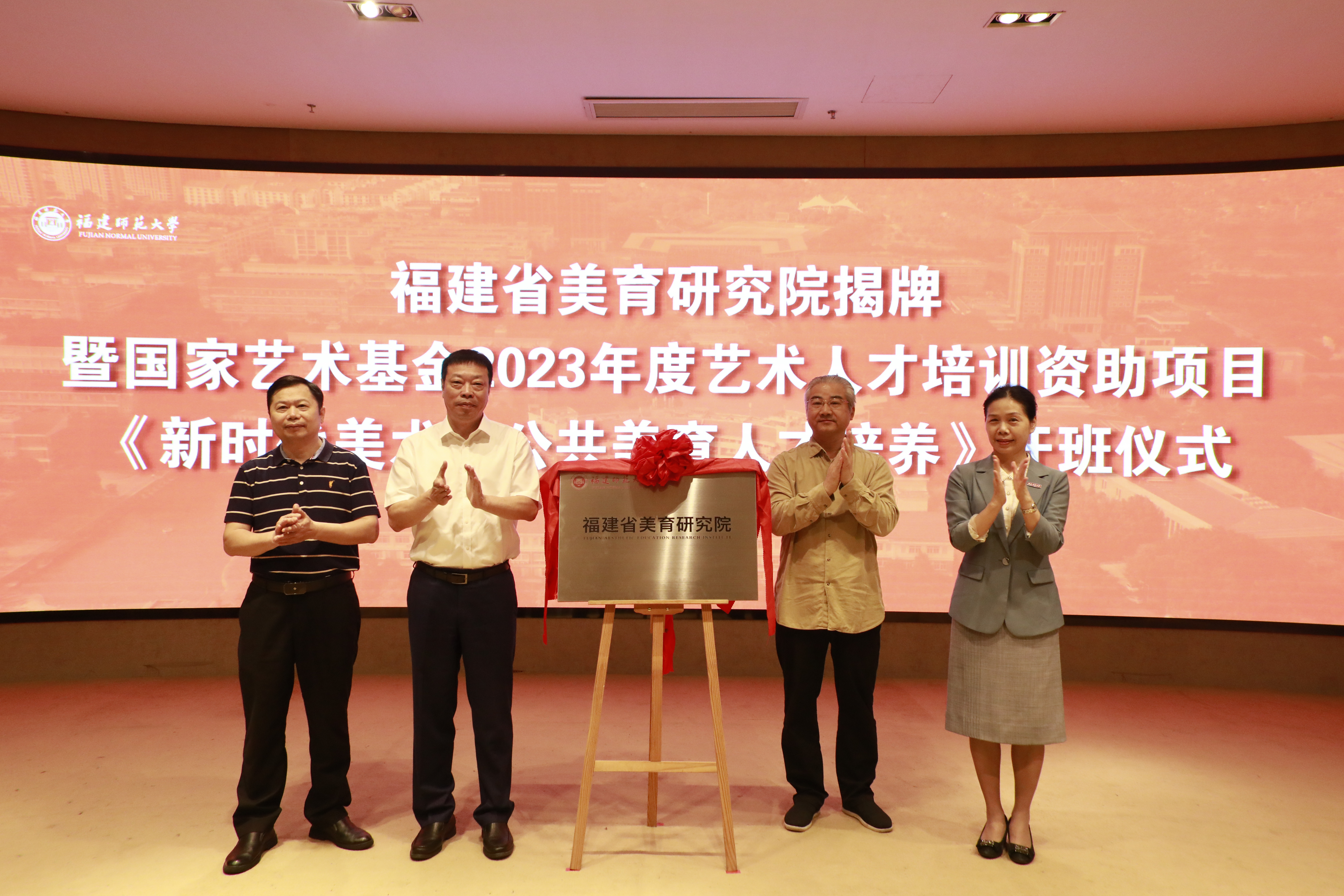 9月18日,福建省美育研究院揭牌暨国家艺术基金2023年度艺术人才培训资助项目《新时代美术馆公共美育人才培养》开班仪式在旗山校区宏达厅举行。省教育厅党组成员、副厅长李绚,省文旅厅副厅长吴新斌,省文联副主席、省美协主席王来文,省文联二级巡视员、省美协秘书长赵胜利,教育部全国中小学美育教指委副主任郑勤砚,省教育厅体卫艺语处处长苏贻堆,我校党委副书记陈晓红,省画院、省美术馆及兄弟院校负责人,国家艺术基金培训项目学员,美术学院师生代表共100多人参加仪式。李绚、吴新斌、王来文、陈晓红共同为福建省美育研究院揭牌。
