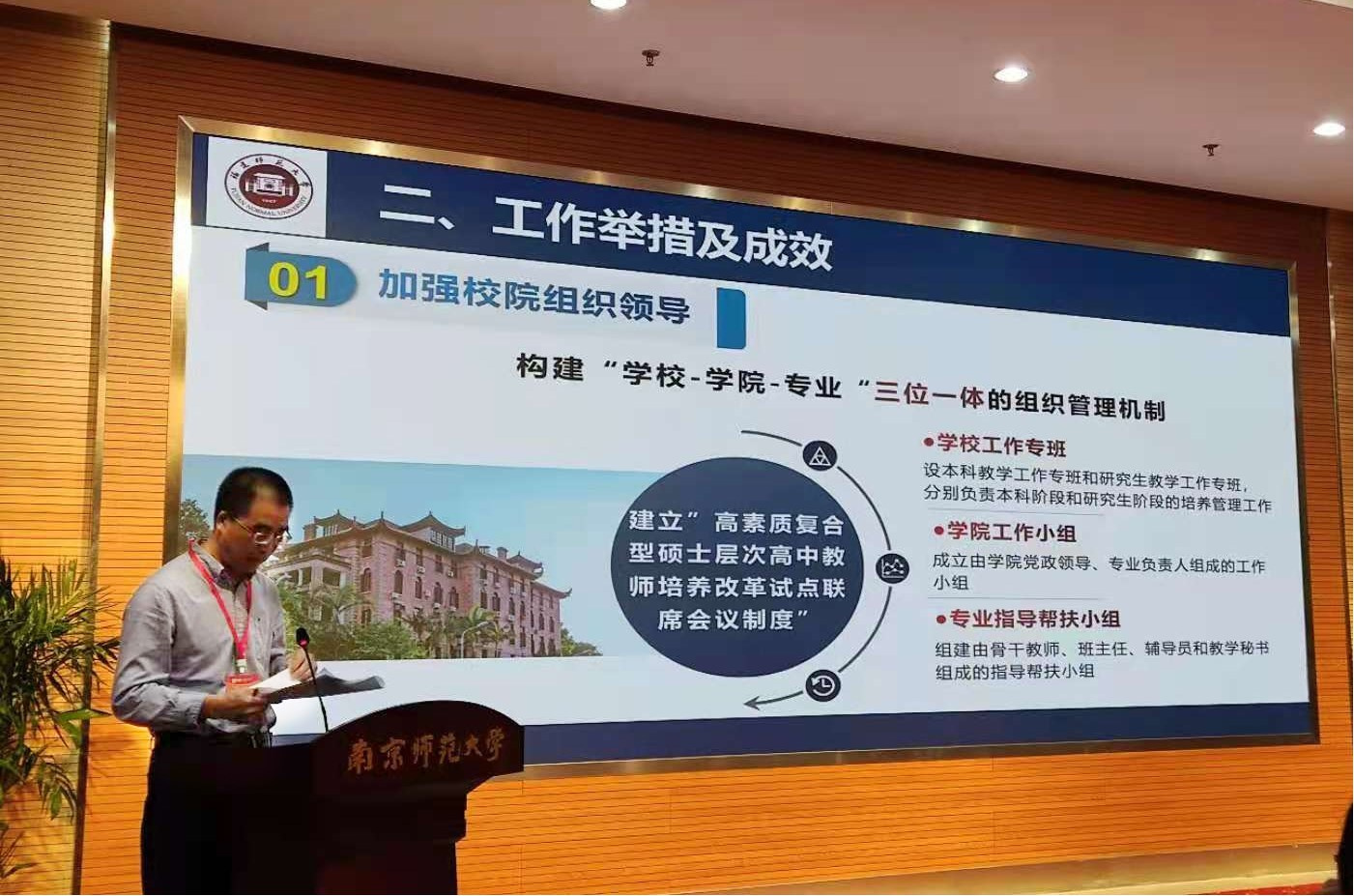 会议于10月18日在南京师范大学召开,教育部教师工作司司长任友群及相关处室负责同志,江苏、浙江、福建三省教育厅有关领导,南京师范大学、浙江师范大学、杭州师范大学及我校四所试点高校领导及相关负责人参加了会议。会议旨在总结高素质复合型硕士层次高中教师培养试点工作经验,进一步深化新时代教师教育人才培养模式改革。