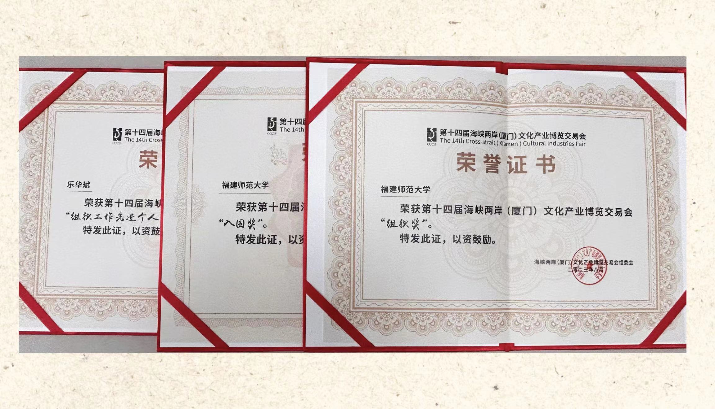 近日,海峡两岸(厦门)文化产业博览交易会组委会表彰结果揭晓。我校荣获第十四届海峡两岸(厦门)文化产业博览交易会“组织奖”和“入围奖”,乐华斌老师荣获“组织工作先进个人奖”。