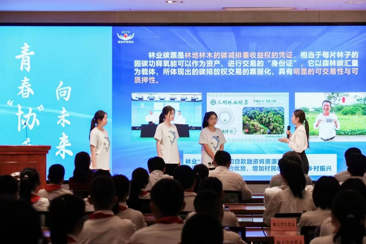 活动现场,我校学生代表通过主题情景剧的形式,展示了2022年省最佳模拟政协提案作品《关于推进林业“碳票”制度改革的建议》。