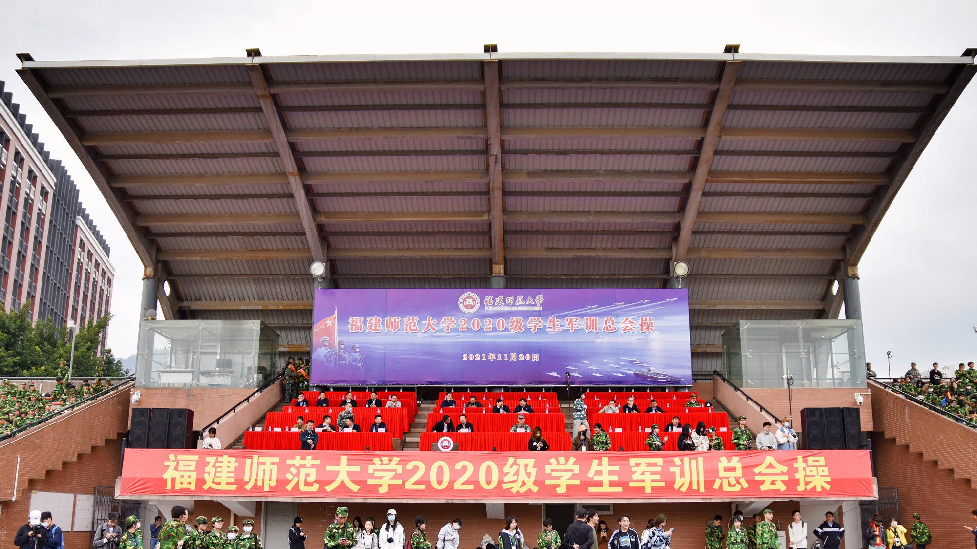 2020级学生军训工作于11月5日拉开序幕,经过14天艰苦紧张、内容丰富的军训训练,我校于11月20日在旗山校区东区田径场隆重举行军训总会操。校党委副书记李绚,军训团团长赵永乐,军训工作领导小组成员单位负责人,各学院(部)分管负责人,2020级辅导员、全体学生参加了总会操。