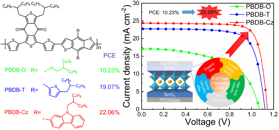 近日,在前期工作(Adv. Energy Mater.2019, 10, 1903146)的基础上,我校化学与材料学院甄红宇课题组再次在国际学术期刊《Advanced Energy Materials》(IF=29.386)上,发表题为《Donor-Acceptor Type Polymer Bearing Carbazole Side Chain for Efficient Dopant-Free Perovskite Solar Cells》的研究论文。该论文创新性地将咔唑作为侧链引入BDT-BDD交替共轭聚合物,利用主链和侧链空穴传输功能基元的协同效应,提高聚合物空穴传输材料的空穴传输性能。该论文以星空下载游戏推荐安卓为第一单位,我校化学与材料学院博士生游国峰为第一作者,甄红宇研究员为通讯作者。该研究工作得到国家自然科学基金和福建省自然科学基金等项目的资助。