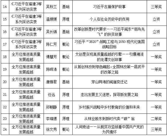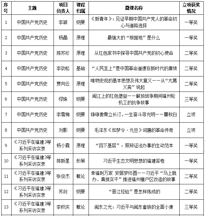 近日,中共福建省委教育工委公布“三个百堂”高校思想政治理论课精品课遴选结果。我校共有24堂思政课入选并立项,其中一等奖9项、二等奖6项、三等奖4项,获奖数量和立项数量均为全省第一。