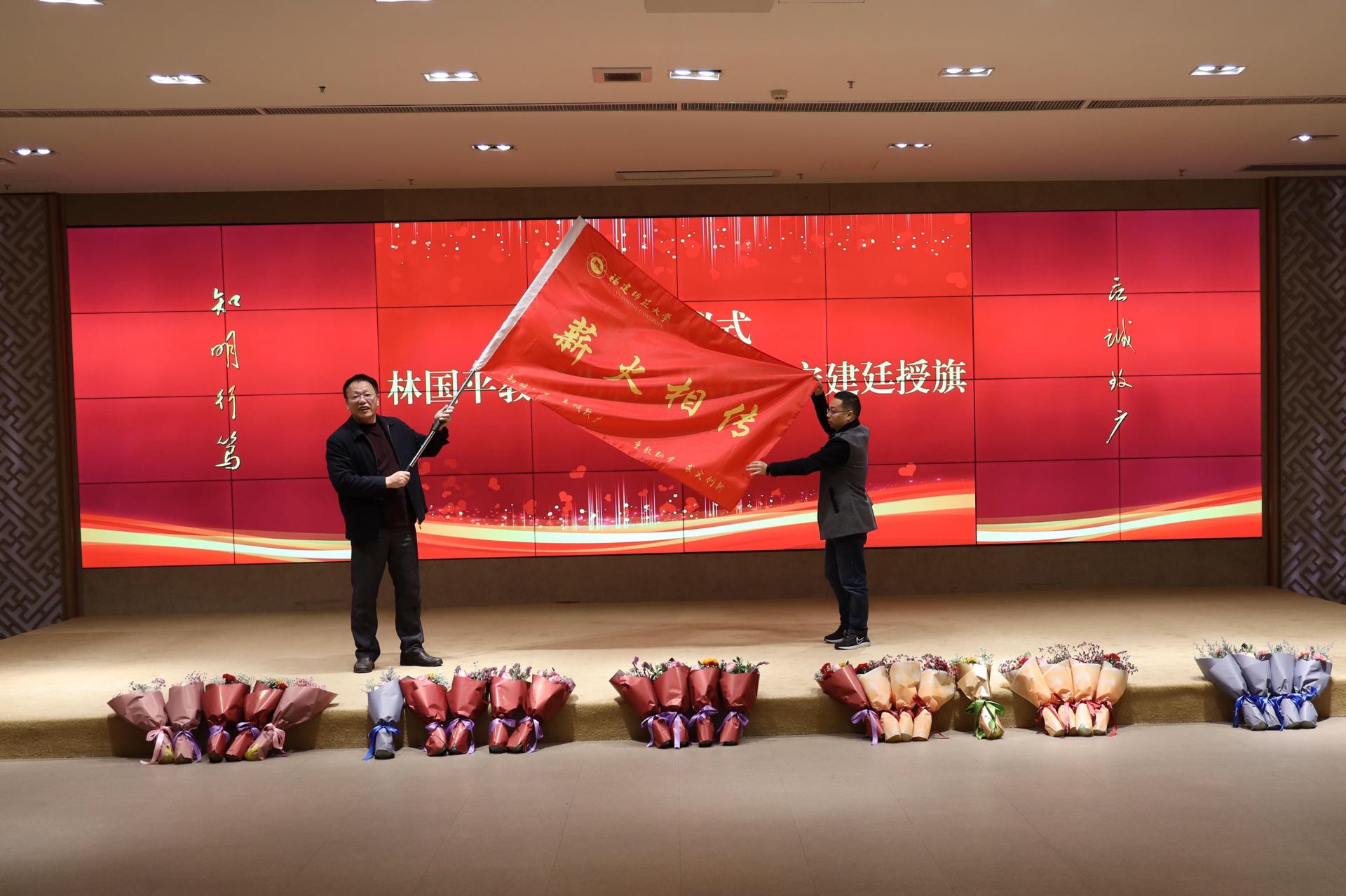 社会历史学院林国平教授代表荣休教职工,感谢学校和各职能部门的关心和帮助,表示将继续发挥余热,为国家、为学校的发展做出力所能及的贡献。仪式上,林国平教授为新教师代表宁建廷授旗,“薪火相传”旗帜传递了荣休教职工对青年教师的殷切期望,预示着一代代师大人接续奋斗的精神生生不息。传播学院学生朗诵《感谢您——亲爱的老师》,代表全体学生为荣休教职工送上真诚的祝福。