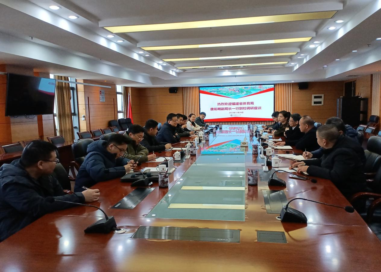 12月26日,省体育局党组成员、副局长唐佑明一行来校调研。副校长陈庆华会见来宾一行,党政办公室、体育科学学院、资产经营有限公司等单位负责人参加座谈。会上,双方就拟依托我校体育中心建设海峡两岸棒垒球交流基地进行了深入交流,并表示将持续推进此项工作。会前,唐佑明一行实地参观了我校体育中心。(资产经营有限公司)