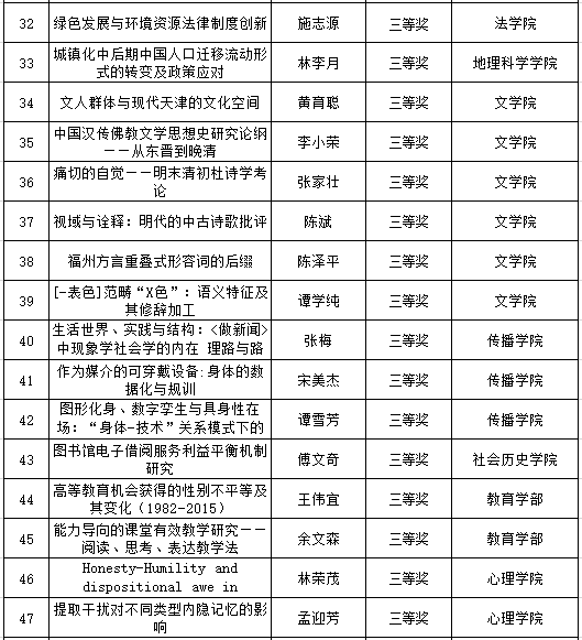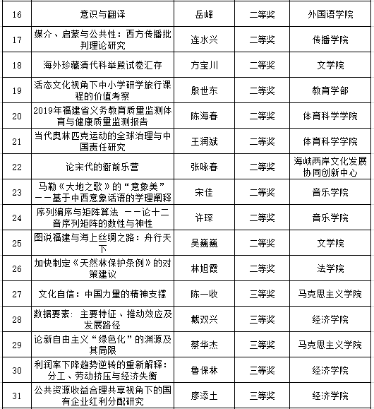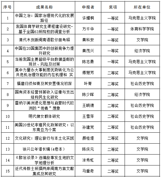 近日,福建省人民政府公布了福建省第十四届社会科学优秀成果奖评选结果。我校共56项成果获奖,其中一等奖5项、二等奖21项、三等奖30项,获奖数量位居省属高校首位。