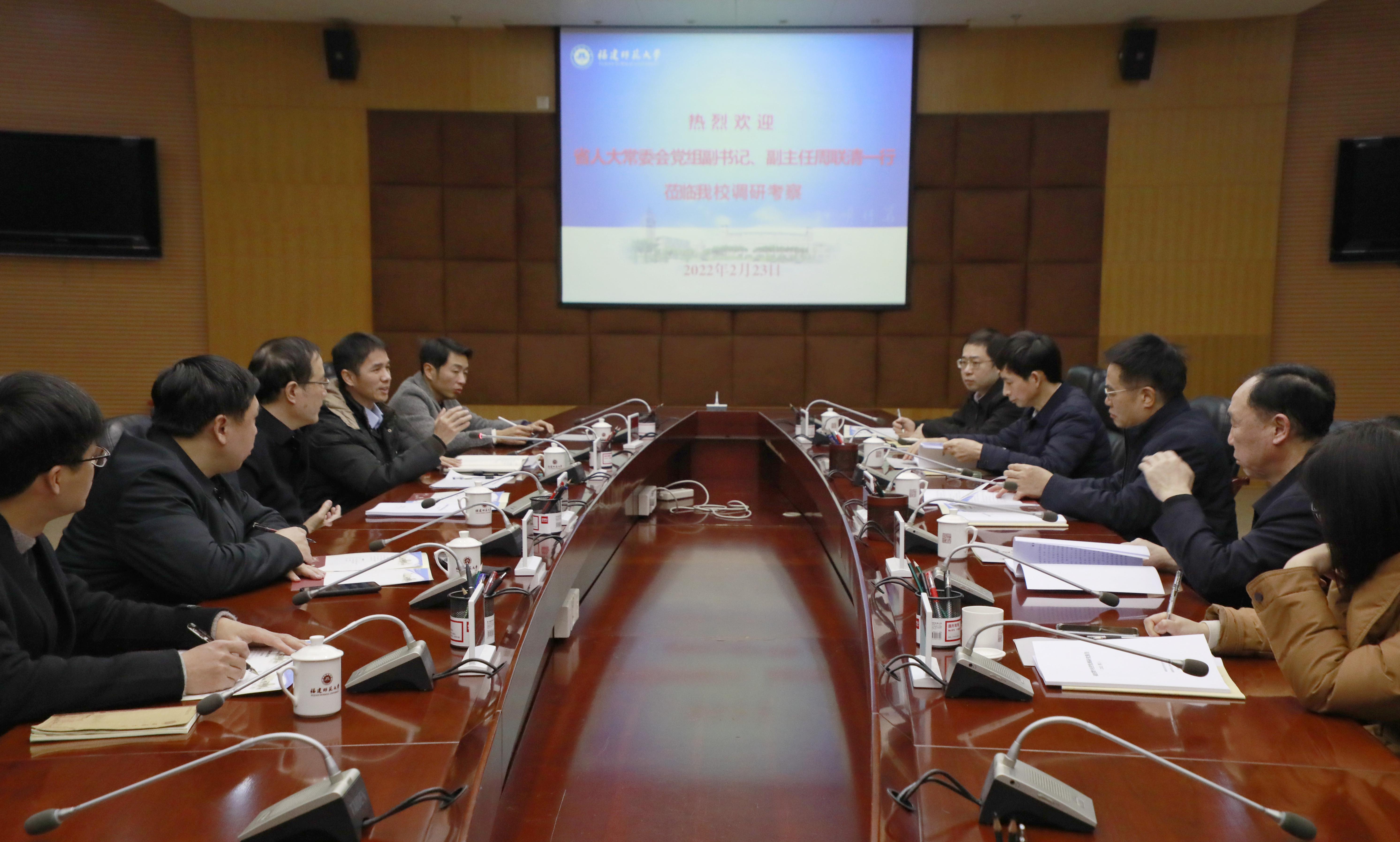 2月23日,省人大常委会党组副书记、副主任周联清莅校调研。省人大常委会委员、财经委副主任委员、常委会财经工委主任梁晋阳,省人大常委会财经工委副主任曹世民,我校领导潘玉腾、王长平,有关单位负责人陪同调研并参加座谈。