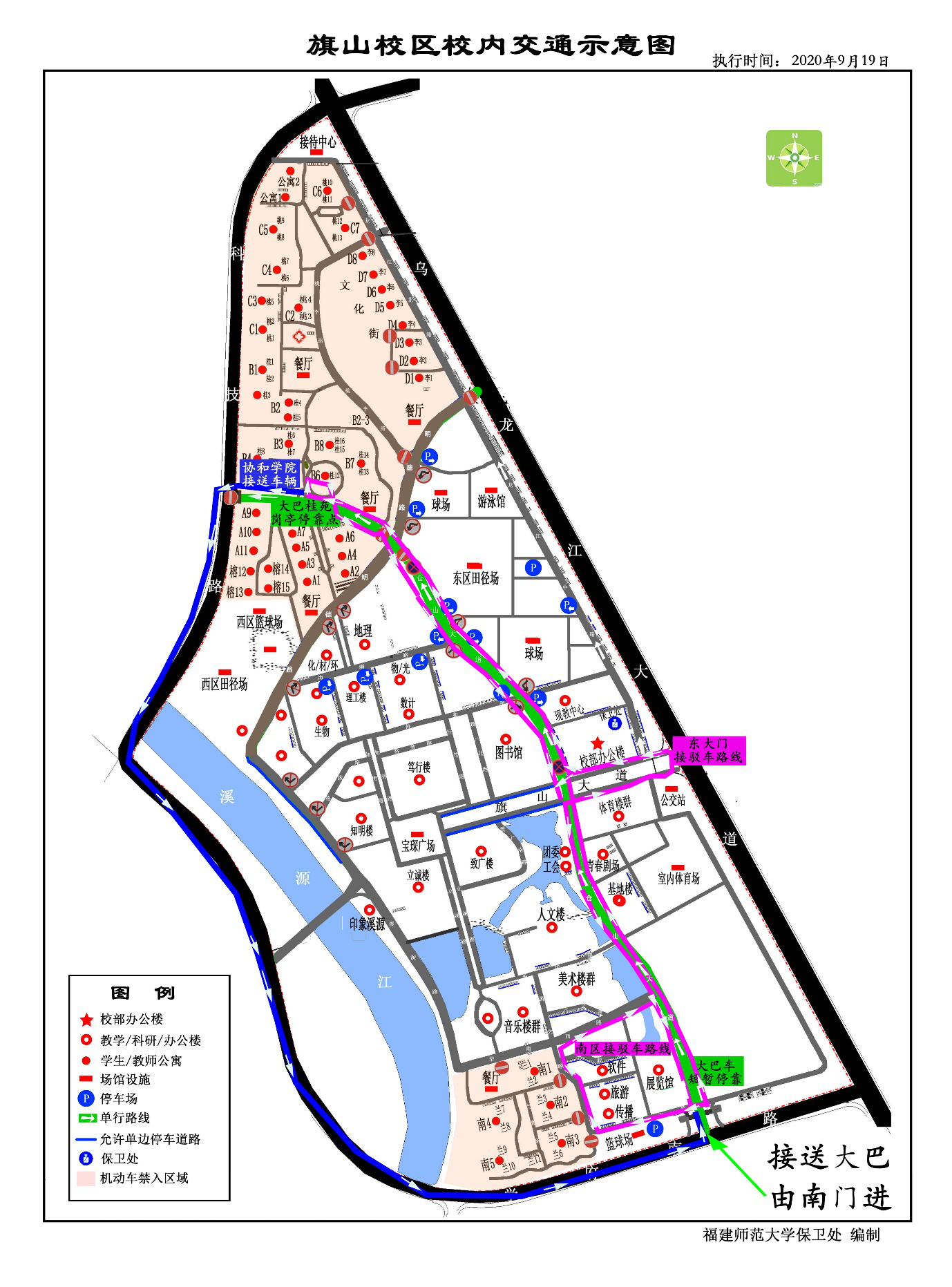 (二)9月20日,学校安排大巴车到汽车北站、火车北站、火车南站接站(限接报到学生和迎新工作人员),接站大巴从旗山校区南门入校,在许书典大楼前短暂停靠,住兰苑生活区的新生下车,各学院志愿者负责引导新生上接驳车至兰苑报到点;之后大巴车沿仓山大道到桂苑保安岗亭前停靠,各学院志愿者负责引导新生至各自报到点,大巴下客后从西门专用通道出校。东门、南门设有校内接驳车点,校内接驳车负责将自行来校学生送至各报到点,负责北区(榕苑、桂苑)的接驳车沿仓山大道到达桂苑保安岗亭后,在桂苑共青团广场内道路调头,原路返回出发点;负责南区(兰苑)的接驳车沿优师西路,经游艺路到兰苑生活区,下客后沿华南西路,经仓山大道返回出发点。协和学院在桂苑保安岗亭前接新生往河西校区的车辆从西门专用通道出校,沿科技路到协和学院河西校区,之后沿学府南路从南大门入校。榕苑、桂苑、兰苑生活区内实行机动车封控,除各单位迎新工作车外禁止机动车通行,各学院请于9月17日到保卫处交通科领取迎新工作车辆通行证,通行证需固定车牌号,每单位限1张,协和学院每系限1张。