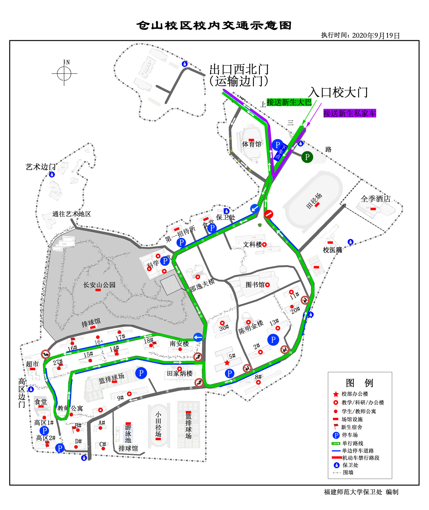 (一)学校接送新生大巴一律从校大门进入校园,沿长安大道——长安中路——公园路(17#楼、16#号)—--公园西路(聚星园餐厅)——青华路——长安东路——西北门①(运输边门)实行单向通行管理。如遇特殊情况,请服从现场指挥。