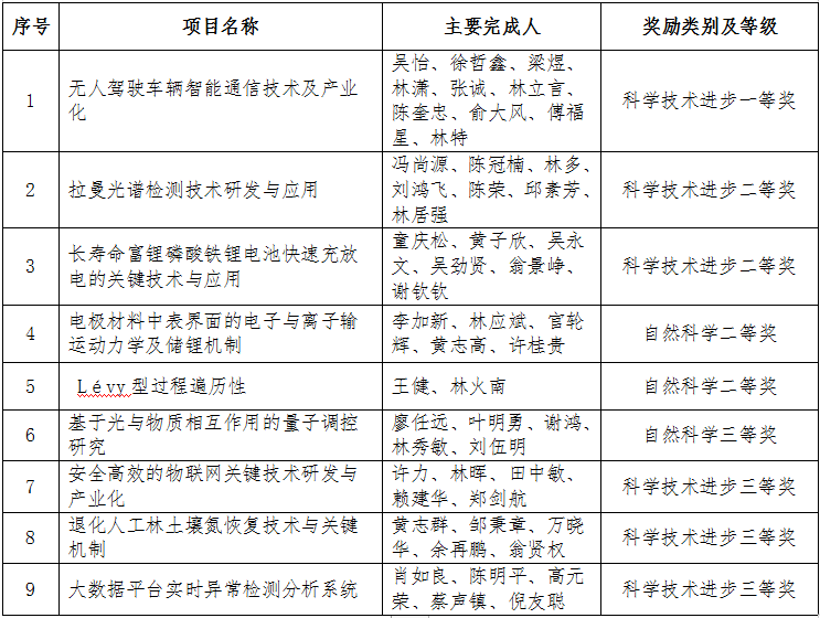 近日,福建省人民政府公布2020年度福建省科学技术奖获奖名单,我校共有9项成果获奖,其中科学技术进步奖一等奖1项、二等奖2项、三等奖3项;自然科学奖二等奖2项、三等奖1项。此外,我校参与完成的4项研究成果获科学技术进步奖三等奖。(科学技术处)