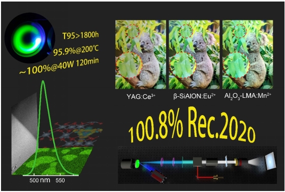 鉴于此,研究团队通过高温真空烧结成功制备出一种Al2O3-LaMgAl11O19: Mn2+窄带绿光发射透明复合陶瓷。由于该材料具备低电声耦合、弱晶体场效应、高刚性结构和单格位掺杂等特性,并引入了强散射、高导热Al2O3第二相,表现出了优异性能特征,包括高色纯度(95.4%)和窄发射带宽(FWHM = 24 nm),以及卓越的热稳定性、湿稳定性和激光辐照稳定性。实验结果表明,该转光材料的内/外量子效率达71%/38%,吸收系数为53%;在高功率蓝光激光辐照下,其光通量达2012 lm@40.0 W,光效达67.7 lm/W。此外,率先构建了基于窄带发光透明复合陶瓷的新型激光显示原型系统,实现了创纪录的宽色域显示(100.8% Rec.2020),显著优于商用YAG: Ce3+基和β-SiAlON: Eu2+基系统。