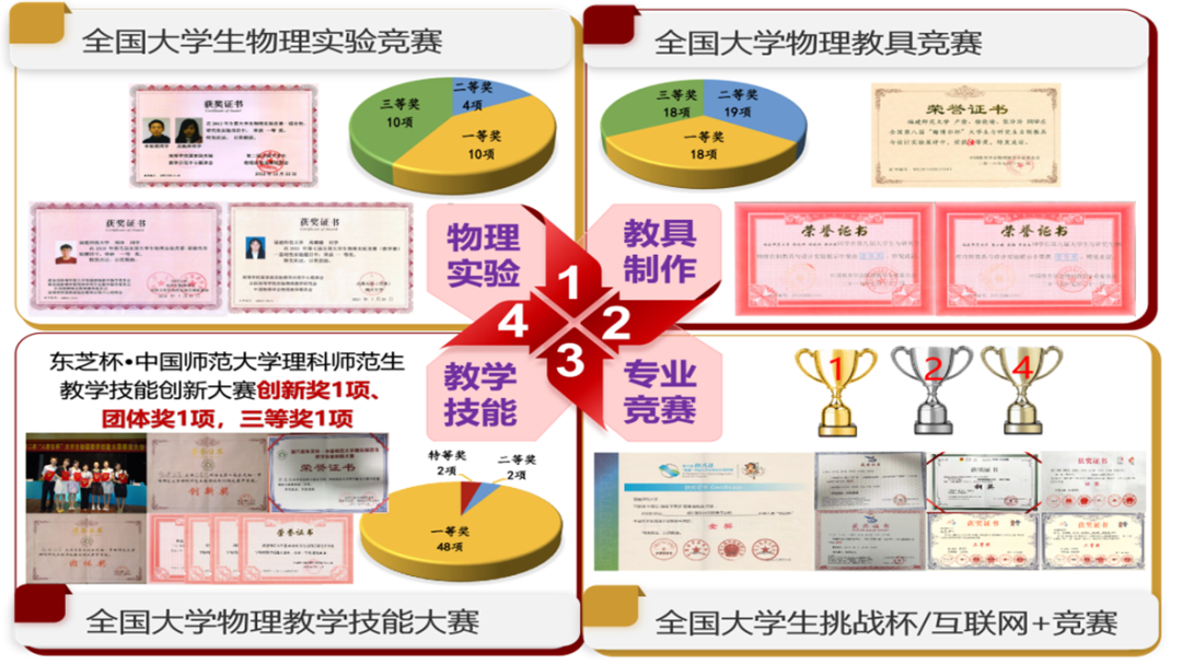 物理实验教学团队依托国家级物理实验教学示范中心,以“规范性、先进性、创新性和应用性”为培养目标,构建“一特色、三阶段、五模块、七课程”的物理实验教学体系,实施“阶段化、单元化、现代化”的教学模式,《大学物理实验》获评国家级精品课程、国家精品资源共享课、国家级一流课程,课程“以队伍、课程和创新平台建设为核心,全面提升大学物理实验教学质量”获得国家级优秀教学成果二等奖,“大学物理实验教学团队”获评国家级教学团队,《大学物理实验》获评国家级“十二五”规划教材。