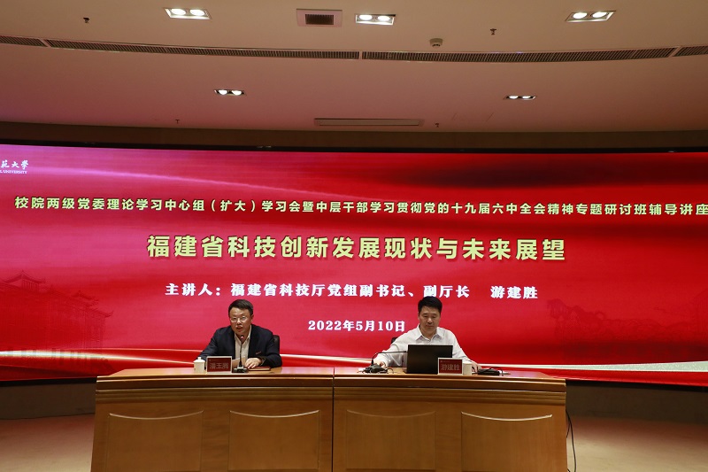 5月10日,校院两级党委理论学习中心组(扩大)学习会暨中层干部学习贯彻党的十九届六中全会精神专题研讨班辅导讲座在旗山校区宏达厅举行,省科技厅党组副书记、副厅长游建胜应邀作题为《福建省科技创新发展现状与未来展望》的辅导报告。报告会由校党委书记潘玉腾主持,校领导、机关部处和各二级党组织主要负责人、各学院院长在主会场参加学习,各二级党组织理论学习中心组成员、其他中层干部通过直播平台在分会场参加学习。