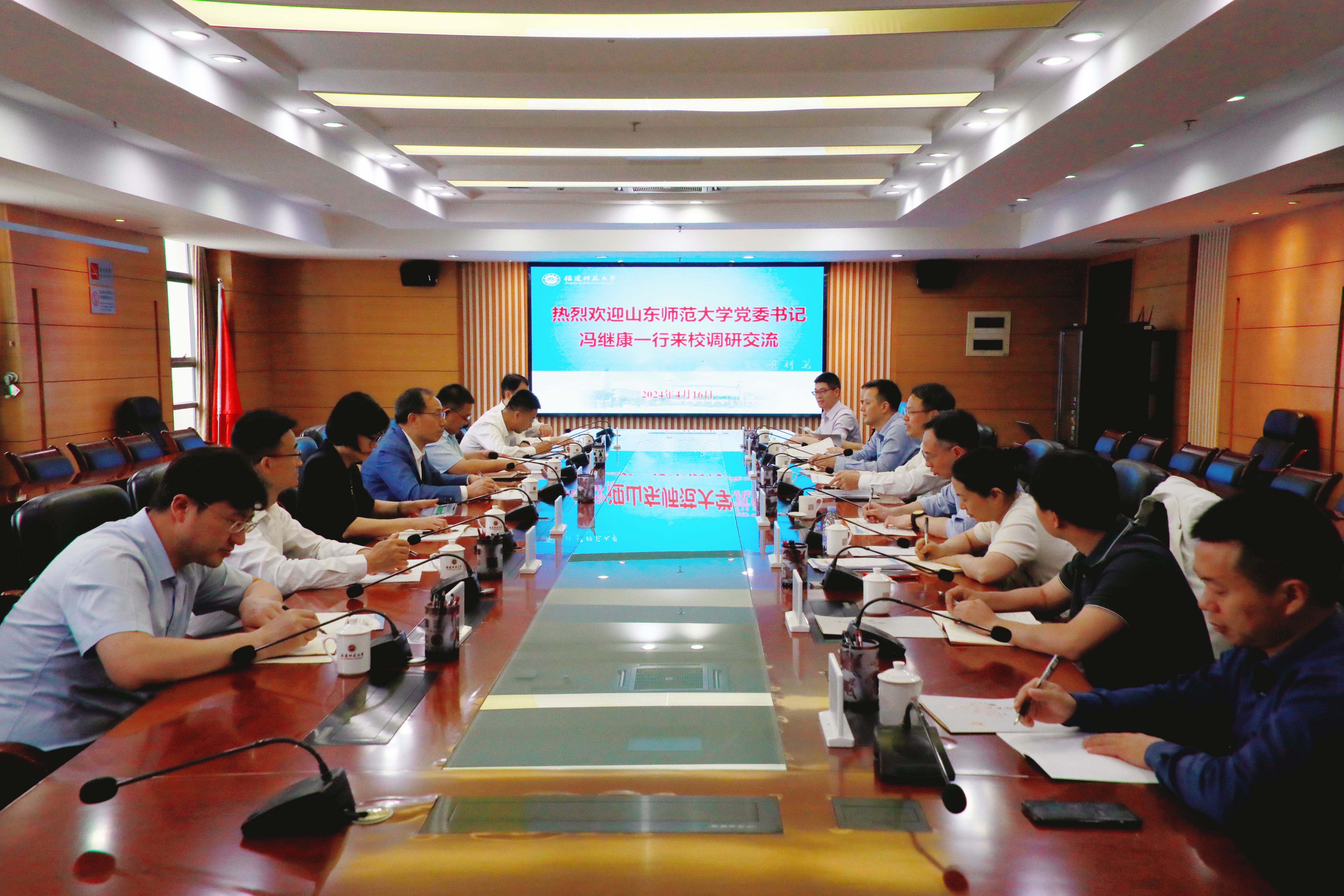4月16日,山东师范大学党委书记冯继康带领相关部门、学院负责人一行7人来校调研交流,校党委书记潘玉腾,党政办公室、组织部、学生工作部、教务处、科学技术处、社会科学处、马克思主义学院等单位负责人参加座谈。