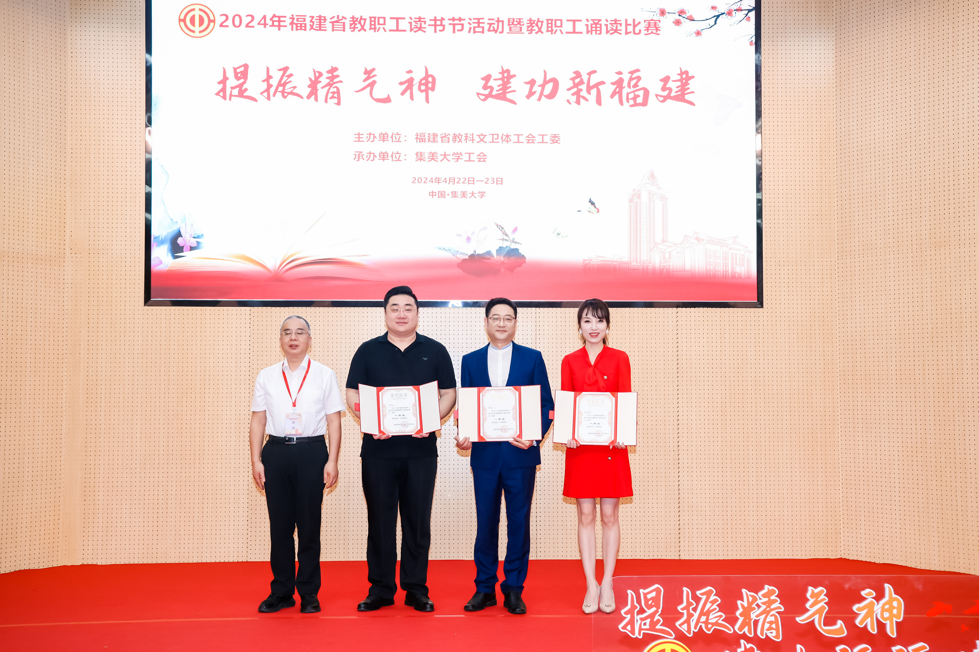 4月23日,由福建省教科文卫体工会主办、集美大学工会承办的2024年全省教职工读书节活动暨“提振精气神 建功新福建”教职工诵读比赛在集美大学举行。我校传播学院彭飙、欧阳丹娜两位老师演绎的作品《等待》获得一等奖(全省第一名),学校获评优秀组织单位。作品《等待》取材于“两弹元勋”邓稼先先生的感人事迹。彭飙、欧阳丹娜两位老师以质朴的语言、真挚的情感,讲述了邓稼先先生为祖国国防事业无私奉献的一生,引发了现场观众的强烈共鸣。(校工会)