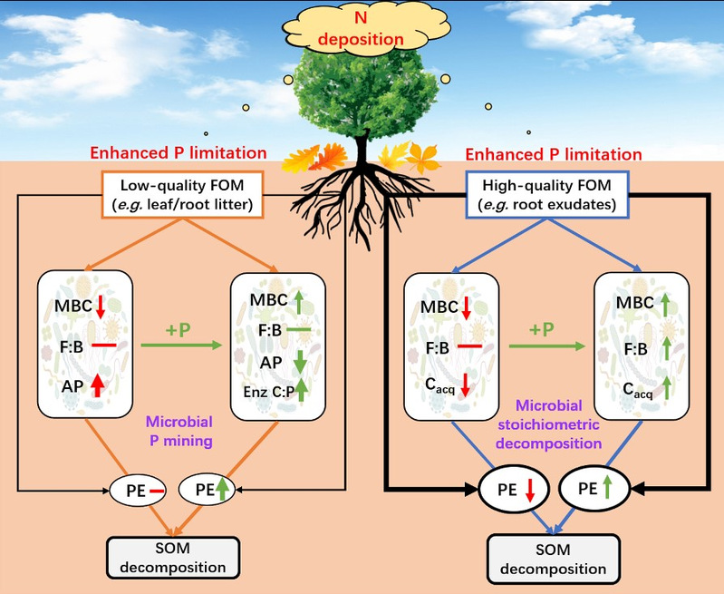 Soil priming effect (SPE) refers to the phenomenon of the increasing or decreasing decomposition rate of soil organic matter (SOM) induced by plant carbon inputs, and is a key mechanism to regulate the SOM decomposition. Tropical and subtropical forests play a vital role in the global carbon cycle and the regulation of global climate change, and they are typical ecosystems rich in nitrogen (N) and poor in phosphorus (P). P is the main nutrient that limits the microbial metabolic processes and SOM decomposition in the forests, and the increasing atmospheric N deposition has further enhanced P limitation. However, how long-term N deposition affects the soil PE in tropical and subtropical forests remains unclear. The limited research on the impact of in-situ nitrogen deposition on SPE in the field is mainly based on nitrogen-limited ecosystems. The findings reveal a new mechanism of soil carbon circulation in tropical and subtropical forests with long-term N deposition regulating P limitation, and provide new insights in terms of mechanisms into their soil carbon acquisition dynamics in the context of global change.