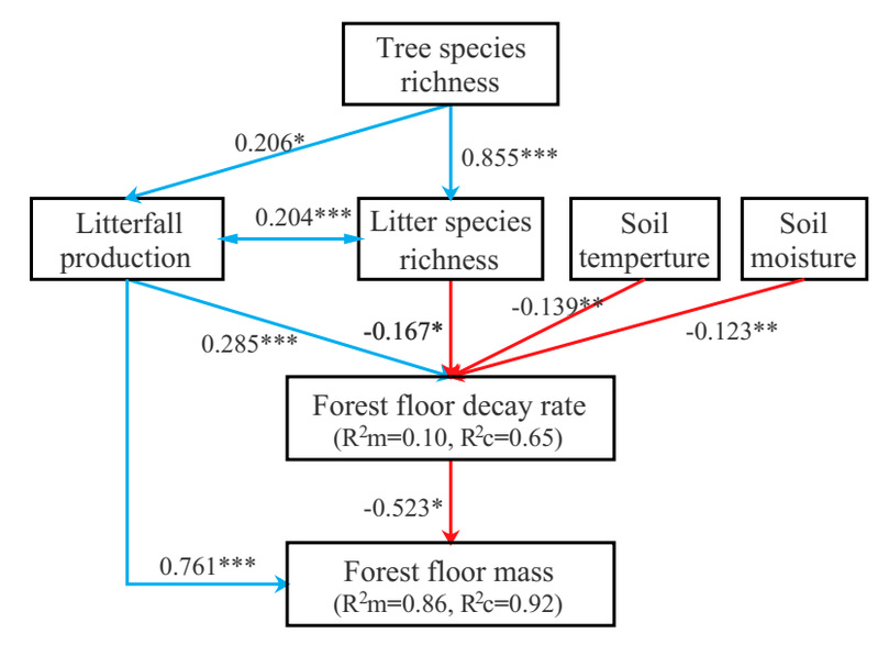 Forest floor accumulation is a key process that influences ecosystem carbon cycling. Despite the evidence suggesting that tree diversity and soil carbon are positively correlated, most soil carbon studies typically omit the response of the forest floor carbon to tree diversity loss. Relying upon the Experimental Platform for Tree Diversity, Functional Characteristics and Ecosystem Functions, established in Longyan, Fujian, Wan Xiaohua, a senior experimentalist with the School of Geographical Sciences, the School of Carbon Neutrality Future Technology of FNU, and her other group members evaluated how tree species richness affects litterfall production, the forest floor decay rate and forest floor mass. The results show that greater tree species richness leads to higher forest floor accumulation at the soil surface through increasing litterfall production – positively linked to functional trait identity (i.e. community-weighted mean functional trait) rather than functional diversity – and unchanged forest floor decay due to two opposite effects canceling each other out, which means tree species richness increases forest floor decay rate through increasing litterfall production while decreasing forest floor decay rate by increasing litter species richness. Compared with the mesh-bag method used to study litterfall decay rate, the mass balance method used in this study to calculate litterfall decay rate offers a more detailed research result of understanding the dynamic relationship between tree species diversity and floor litterfall decay rate in the forest, which may help understand how tree species diversity affects ecosystem carbon cycling and services better.