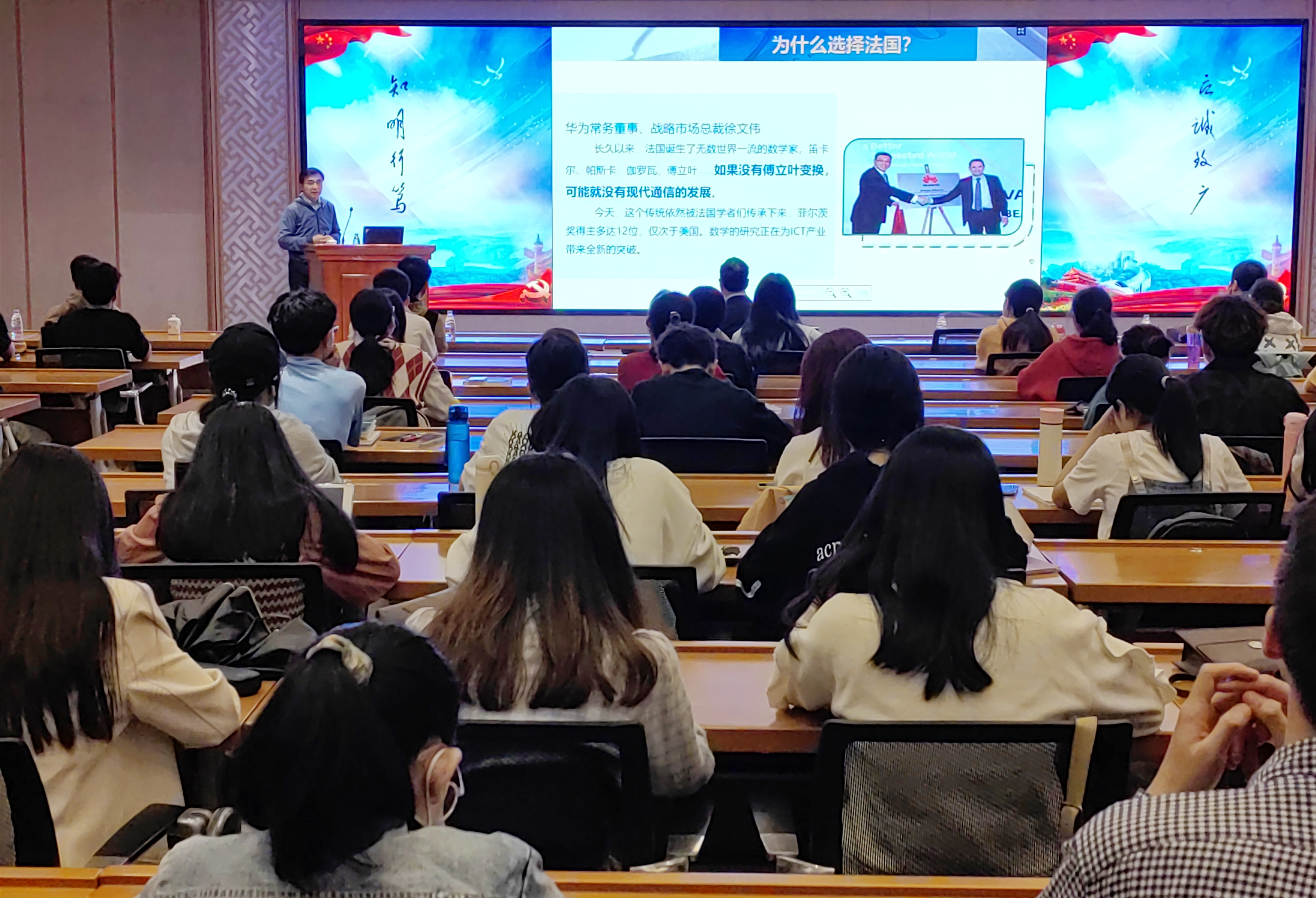 汤涛院士首先从华为创始人任正非强调数学的重要性谈起,介绍了华为如何借鉴俄罗斯、法国等国家的数学研究推动信息通信的发展。他用信息科技、科学计算以及金融数学发展史中的丰富案例展示了现代数学的魅力和重要作用,强调了占领数学高地与占领技术高地的关系。他还就数学学习、计算数学的发展、计算数学软件的开发与应用等话题与师生进行了互动交流。