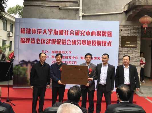 12月7日,海峡社会研究中心揭牌暨福建省老区建设促进会研究基地授牌仪式在文园举行。海峡两岸关系协会副会长孙亚夫,省政协副主席阮诗玮,省政协经济委员会原主任、省老促会执行会长叶顺煌,省民政厅原巡视员、省老促会常务副会长罗万荷,省政协科教文卫体委员会副主任江登峰,团省委副书记陈训明,福州市人大常委会副主任李永祥,省民政厅原副巡视员林跃强,校长王长平,原副校长郑一书,社会科学处、文学院、社会历史学院等相关教师代表参加了仪式。