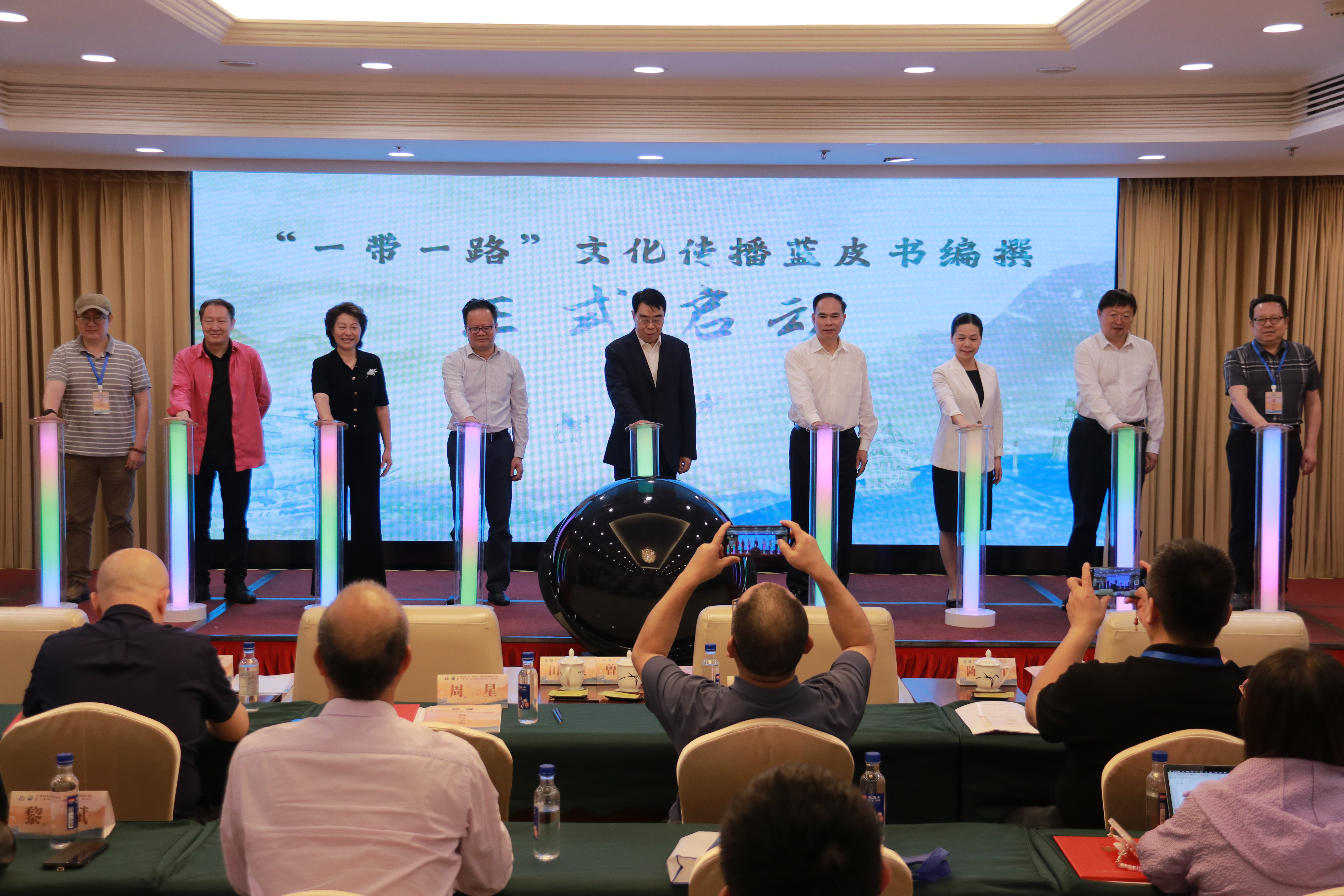 随后,周然毅宣读研究基地换届文件,田进为研究基地主任颁发聘书,“一带一路”文化传播研究基地主任、传播学院李岚教授代表研究基地发言。田进、陈晓红共同为第二届“一带一路”文化传播研究基地揭牌,与会嘉宾共同启动了“一带一路”文化传播蓝皮书编撰活动。