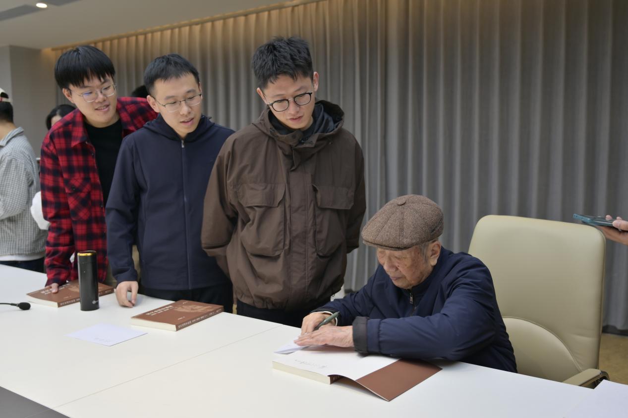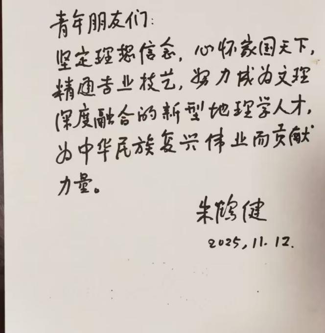 采访中,朱鹤健教授以“教育老兵”的谦逊姿态,结合七十载执教经历,用朴实真挚的话语回应同学们的提问,传递治学育人的初心与坚守。采访后,正值朱鹤健教授专著《现代地理学新探:科学观·应用观·教育观》从1170种书目中脱颖而出入选首届“韬奋好书”。学生纷纷与朱鹤健教授就专著内容、学科专业、职业规划等进行交流,并与朱鹤健教授合影留念。朱鹤健教授在青年学子们的书本上亲笔寄语,鼓励大家在地理学、生态学学习科研道路上锐意进取、勇攀高峰。
