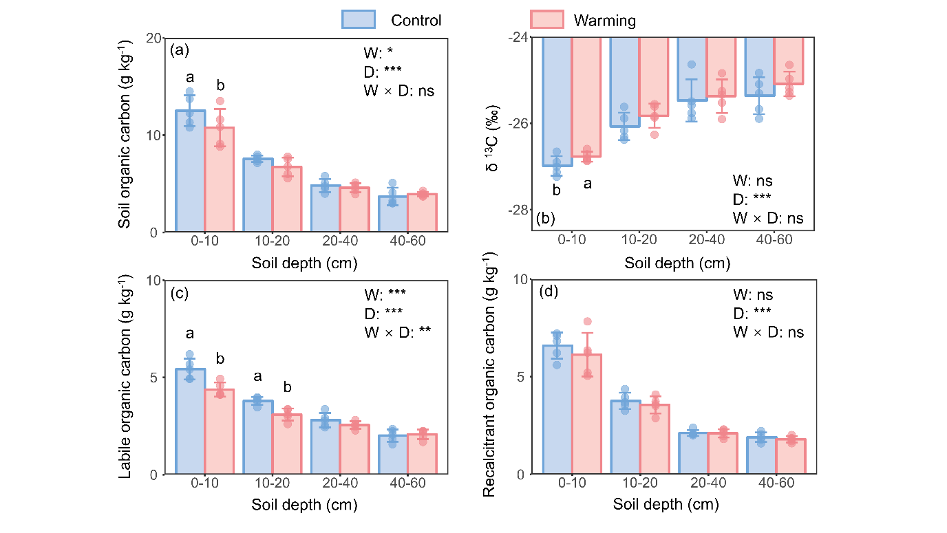 针对上述科学问题,研究人员依托福建三明森林生态系统国家野外科学观测研究站2014年建立的杉木(Cunninghamia lanceolata)人工林土壤增温实验平台。在增温后第三年,通过分析不同土层(0-60 cm)土壤易分解有机碳和难分解有机碳等组分,并结合微生物群落结构、碳循环相关胞外酶活性以及细根生物量等指标,系统评估了气候变暖背景下不同土层土壤碳组分的响应特征及其驱动机制。研究发现,增温显著降低了表层土壤(0-20 cm)易分解有机碳含量(降幅约为 19%),但深层土壤(20-60 cm)中易分解与难分解有机碳含量在增温后均未有显著改变。且表层与深层土壤有机碳对增温的响应机制不同:增温通过促进碳水解酶活性,调整微生物群落结构向寡营养型方向的转变促进表层土壤易分解有机碳的分解;在深层土壤中,增温通过增加细根碳输入维持土壤有机碳的稳定。此外,增温后表层与深层土壤难分解有机碳含量均未发生显著改变,挑战了难分解碳具有更高的温度敏感性的传统认知。研究结果为改进亚热带森林碳循环模型、评估气候变暖对土壤碳库稳定性的影响提供了关键的科学依据。