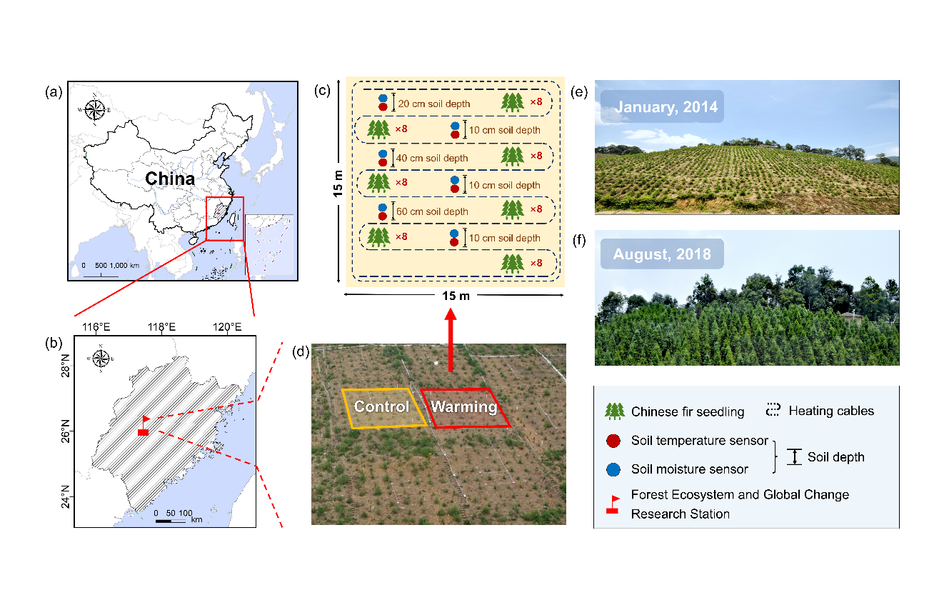 气候变暖深刻影响陆地生态系统碳循环过程。人工林作为应对气候变化的重要举措,其碳汇能力对未来气候变暖的响应备受关注。然而,当前有关气候变暖对人工林土壤有机碳的影响仍缺乏相关研究,尤其是深层土壤有机碳组分对气候变暖的响应模式及其调控机制更是鲜有报道。