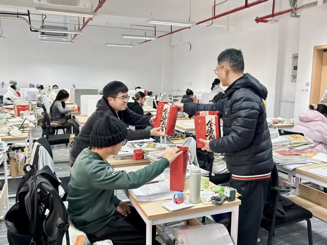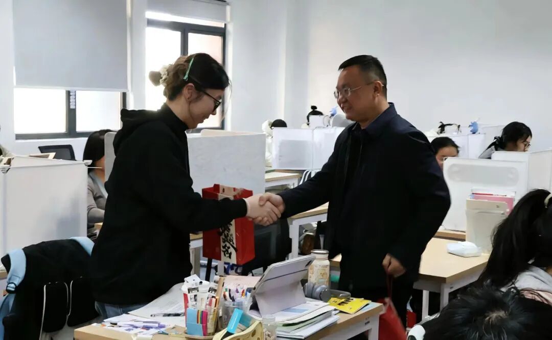 在自习室,院领导们实地了解了同学们的冲刺备考状态,与大家亲切交谈并送上装有朱鹤健教授亲笔寄语卡片、文具、暖贴等实用物品的考研礼包,叮嘱同学们在冲刺阶段放平心态、注意身体,祝福大家取得优异成绩。